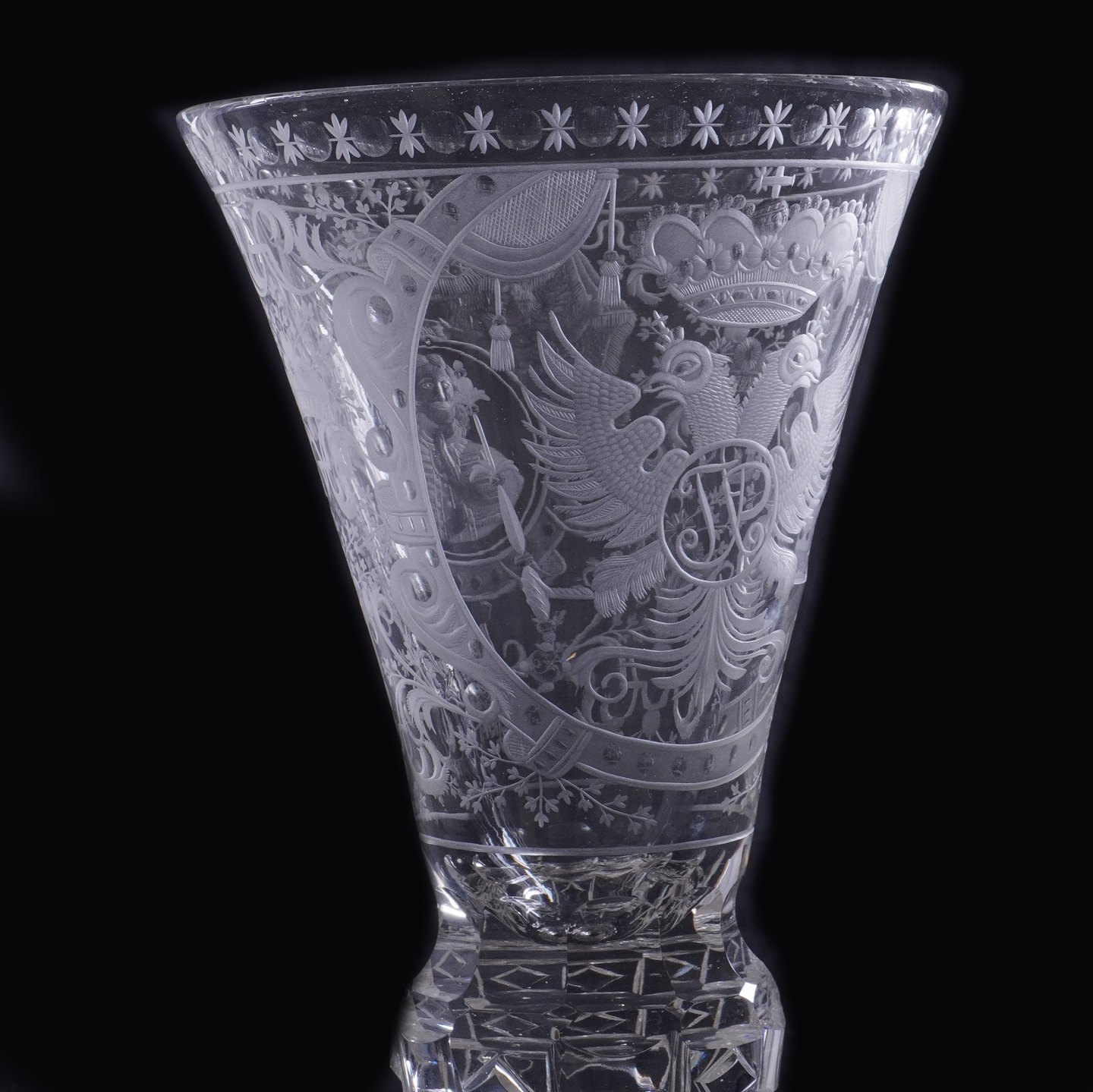 Beskrivelse: Tysk glas pragtpokal indgraveret med adeligt portræt og kronet spejlmonogram