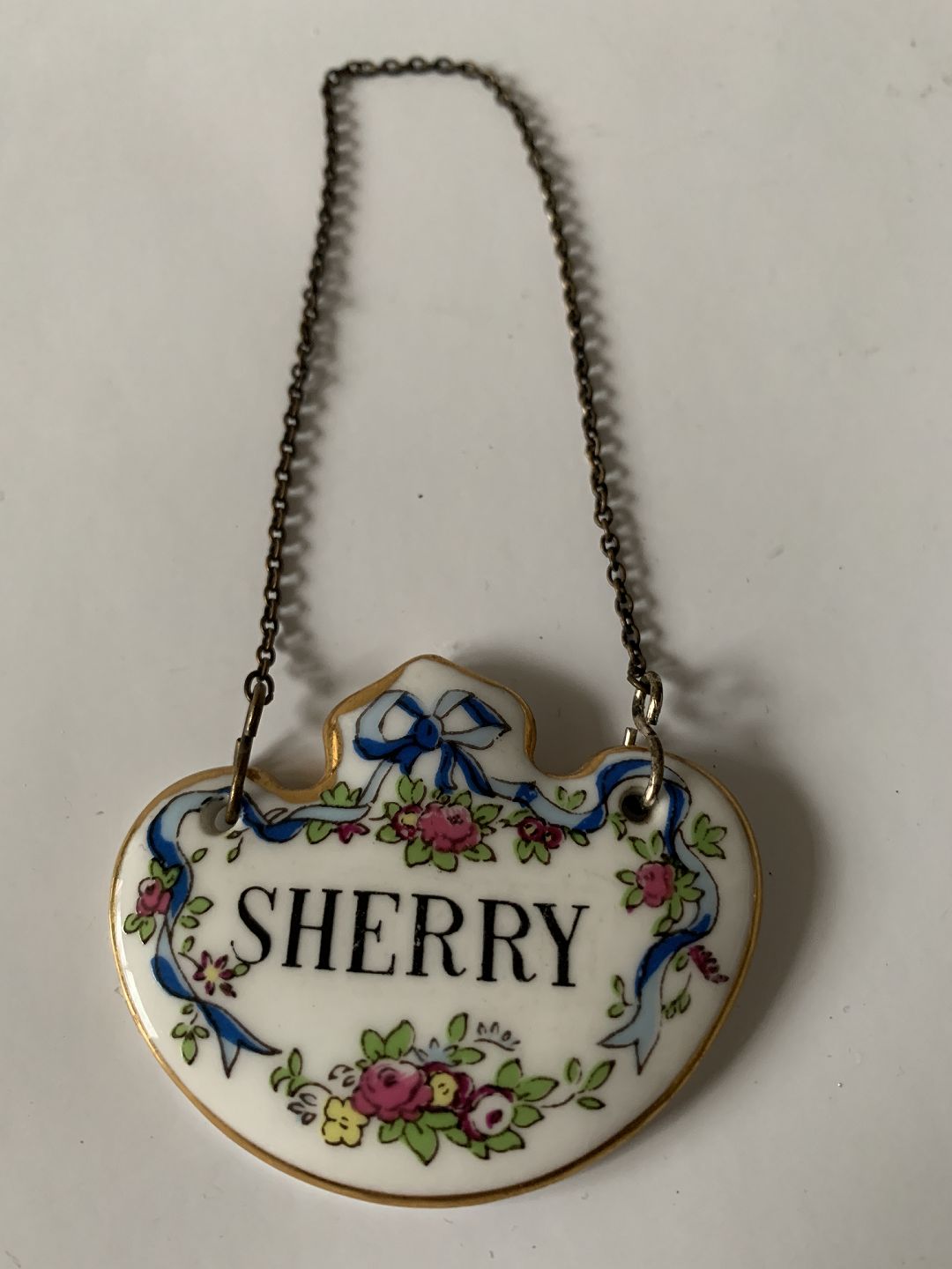 Beskrivelse: Flaske / Karaffel Sherry skilt med kæde