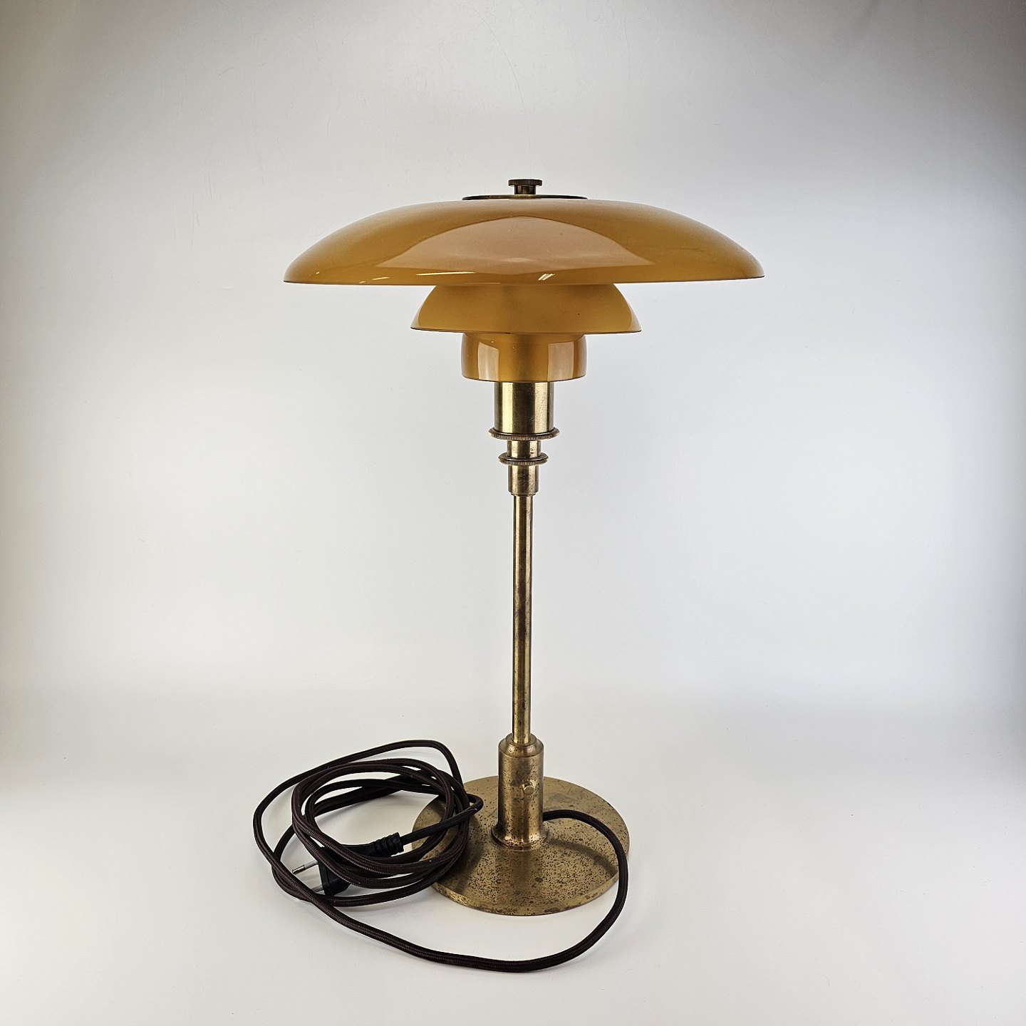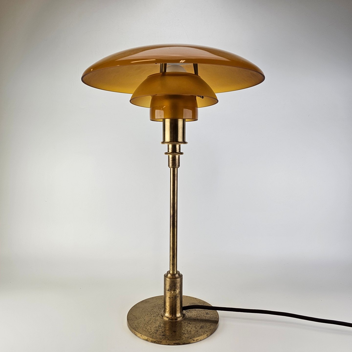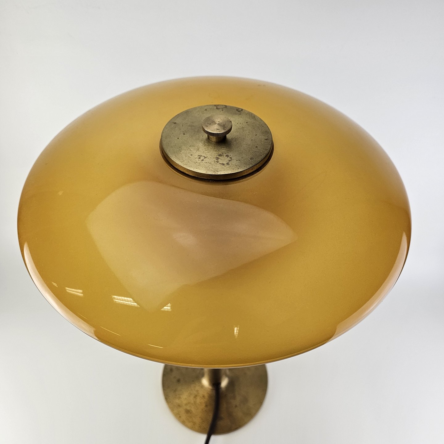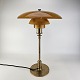 Beskrivelse: Bordlampe med skærm af mundblæst ravfarvet etlagsglas og fod af strøgslebet messing Limited edition udført efteråret 2018