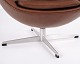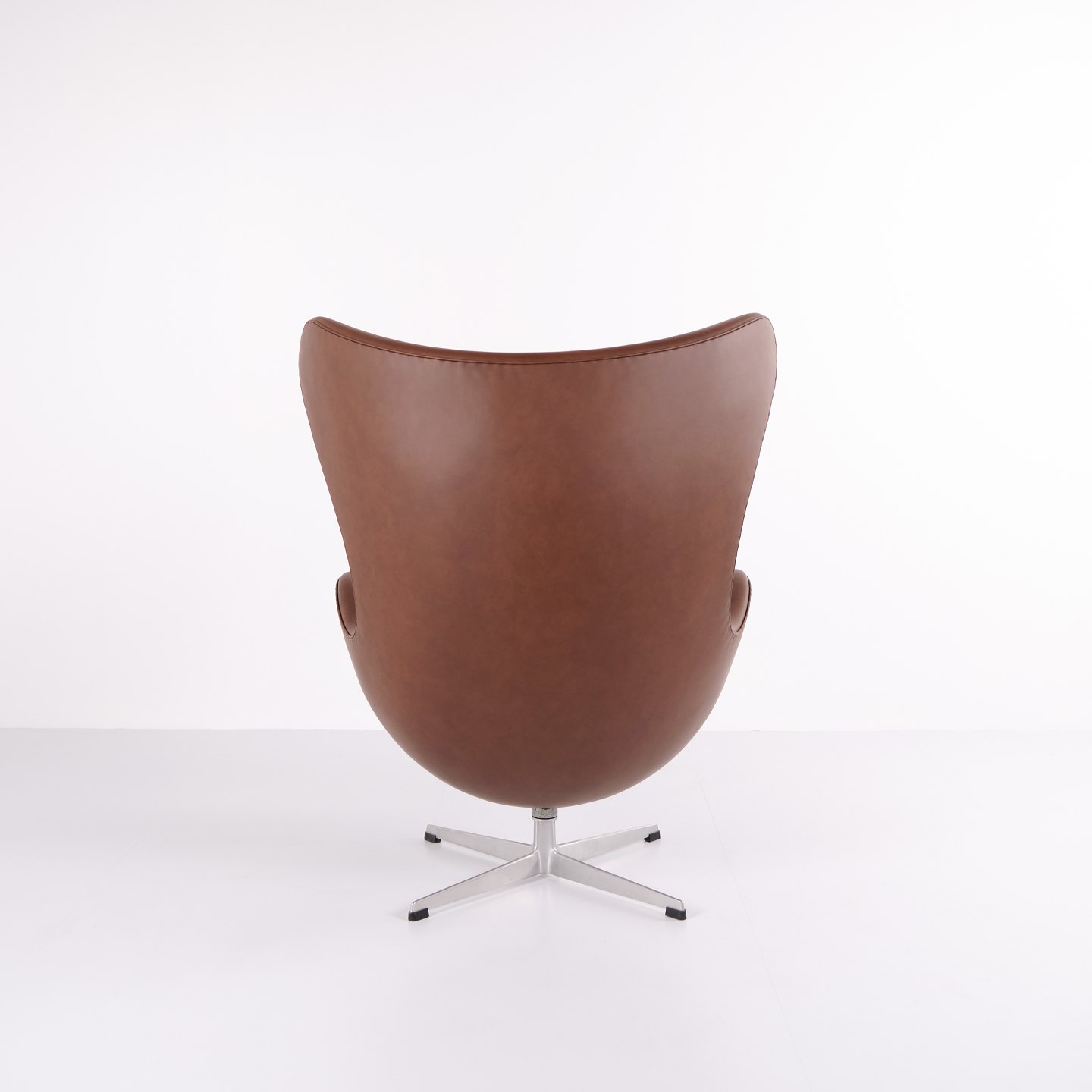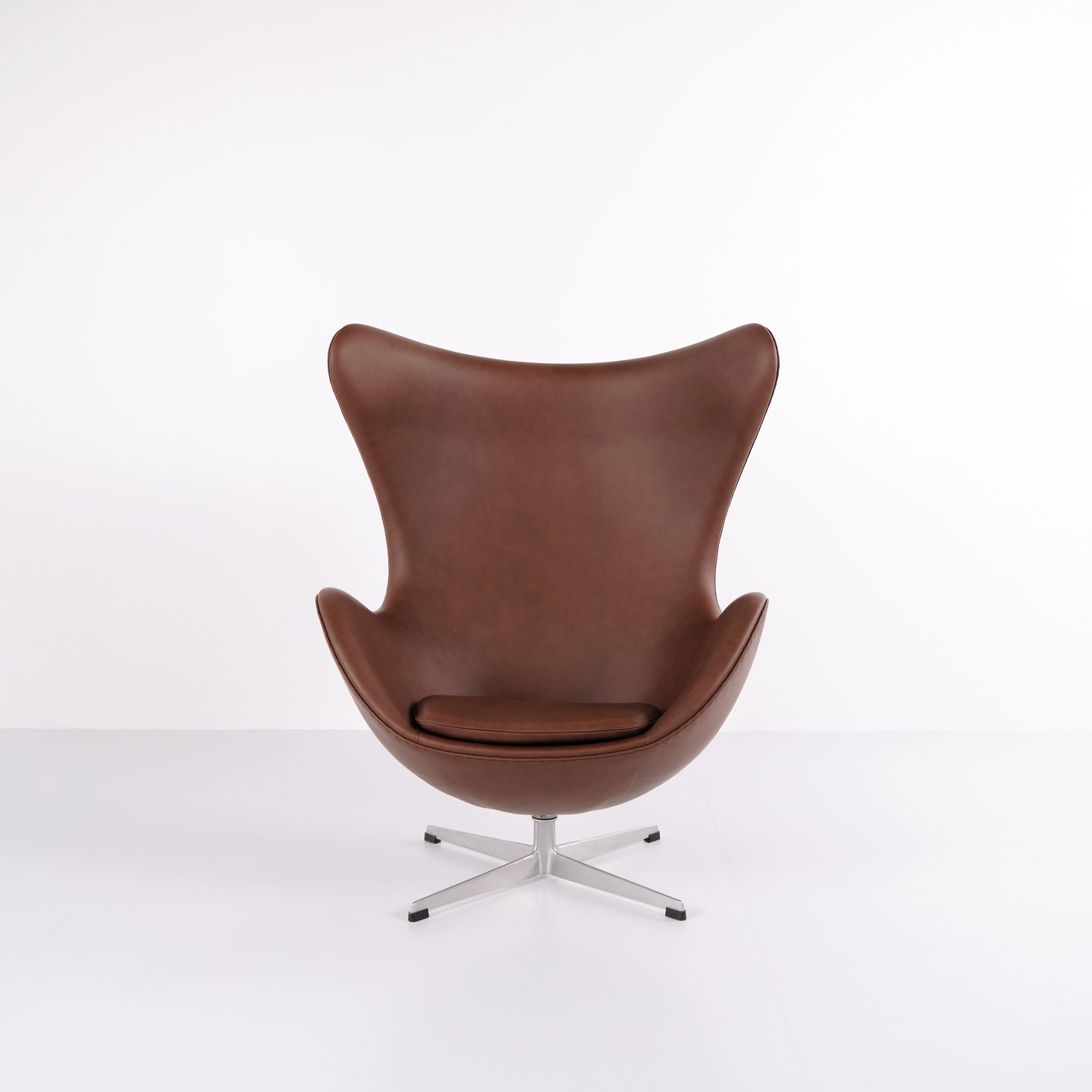Beskrivelse: Arne Jacobsen Ægget, model 3316 fra Fritz Hansen. Ny­polstret i brunt læder. Et dansk designikon fra 1958.