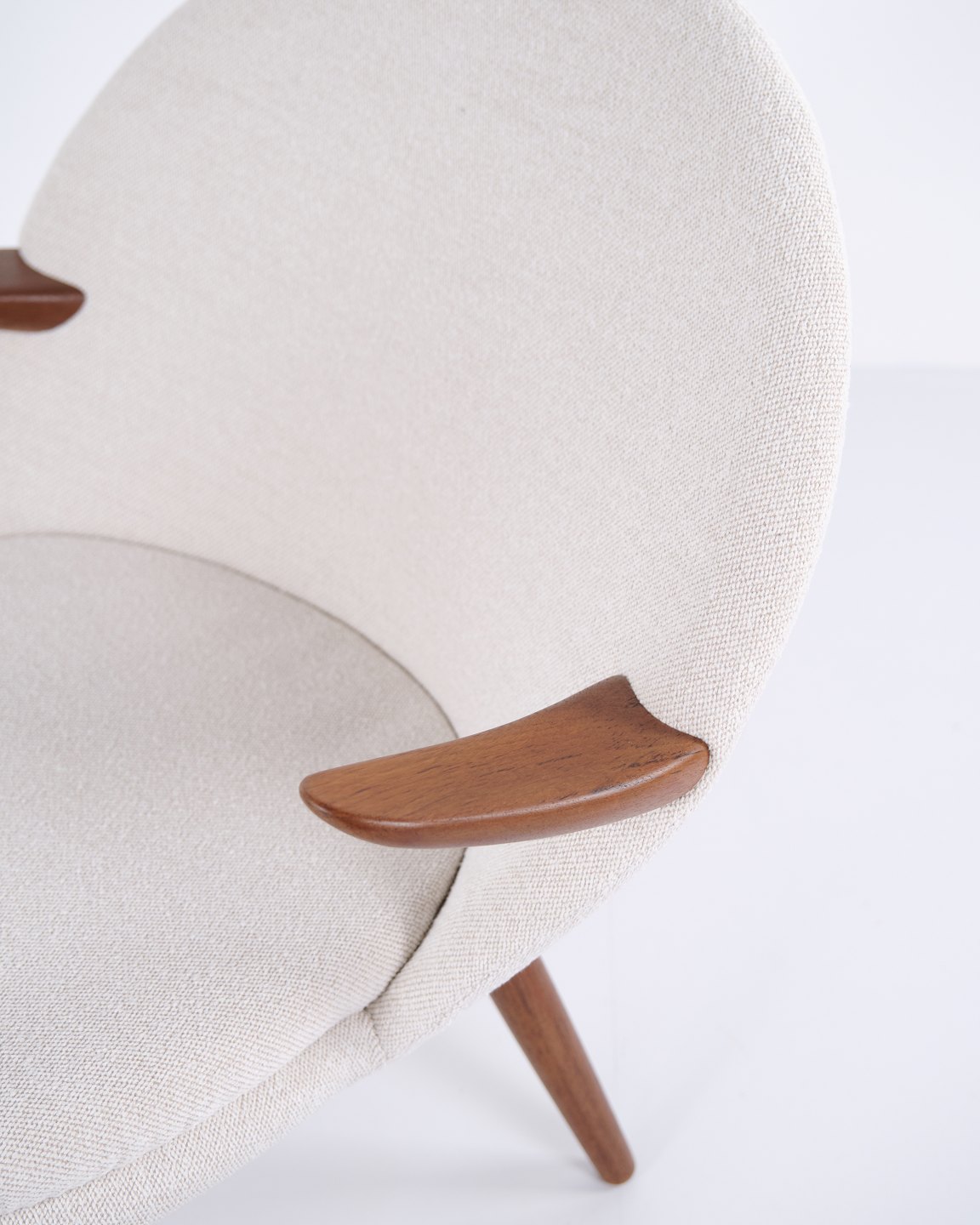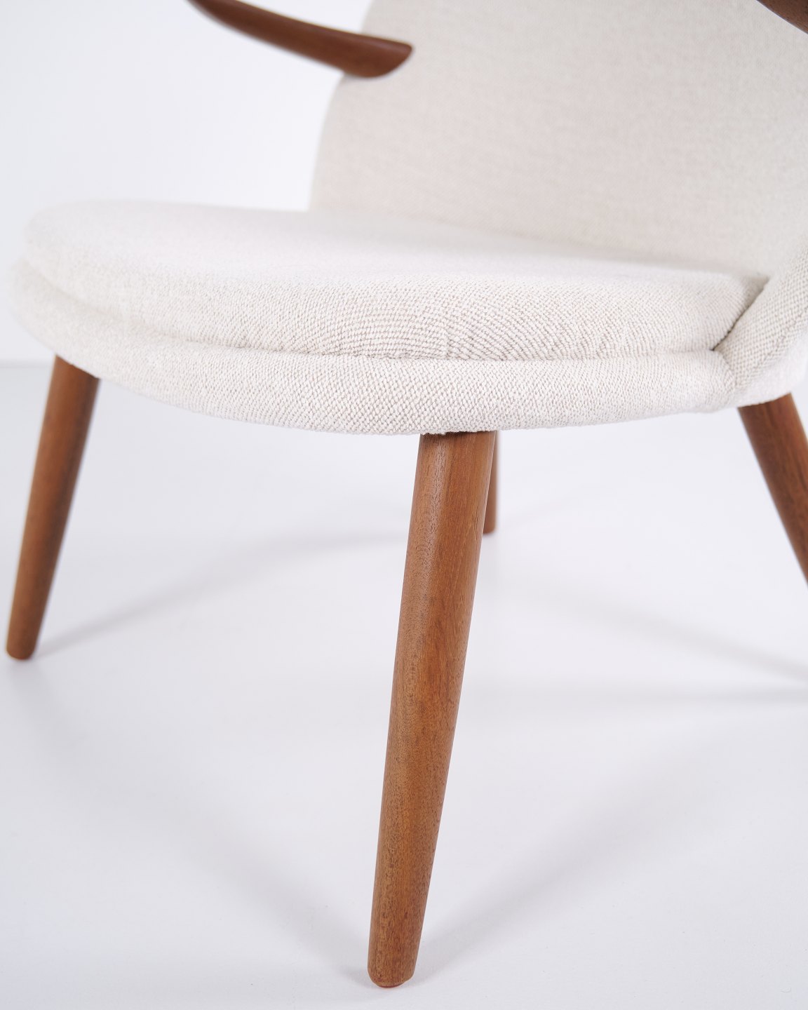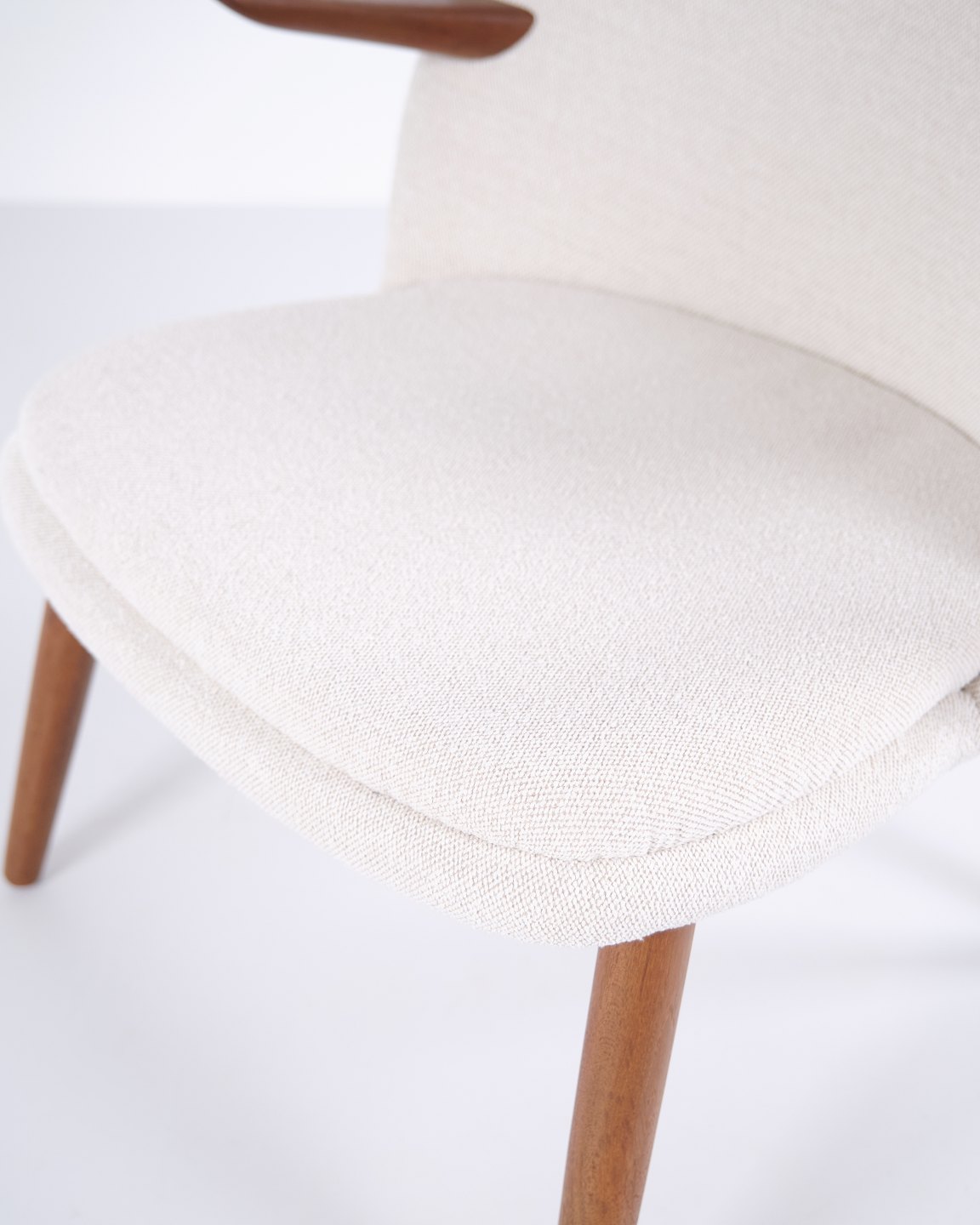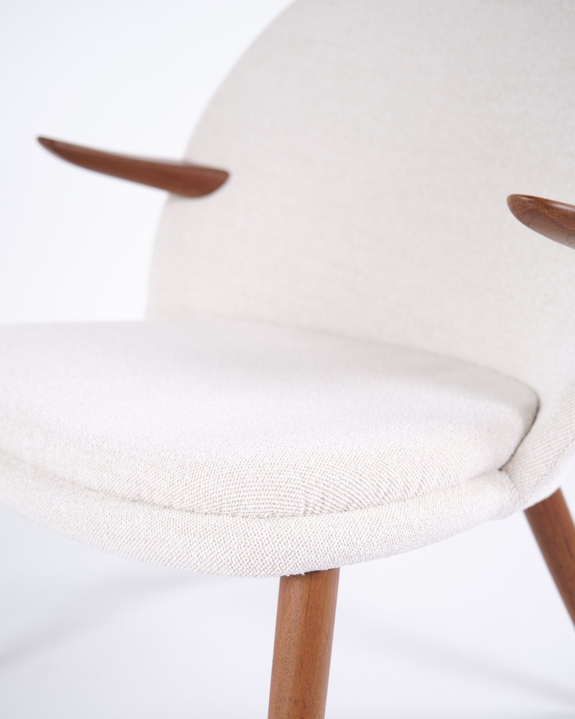 Beskrivelse: Kurt Olsen lænestol fra Glostrup Møbelfabrik. Teaktræ med lyst stof, 1960’erne.