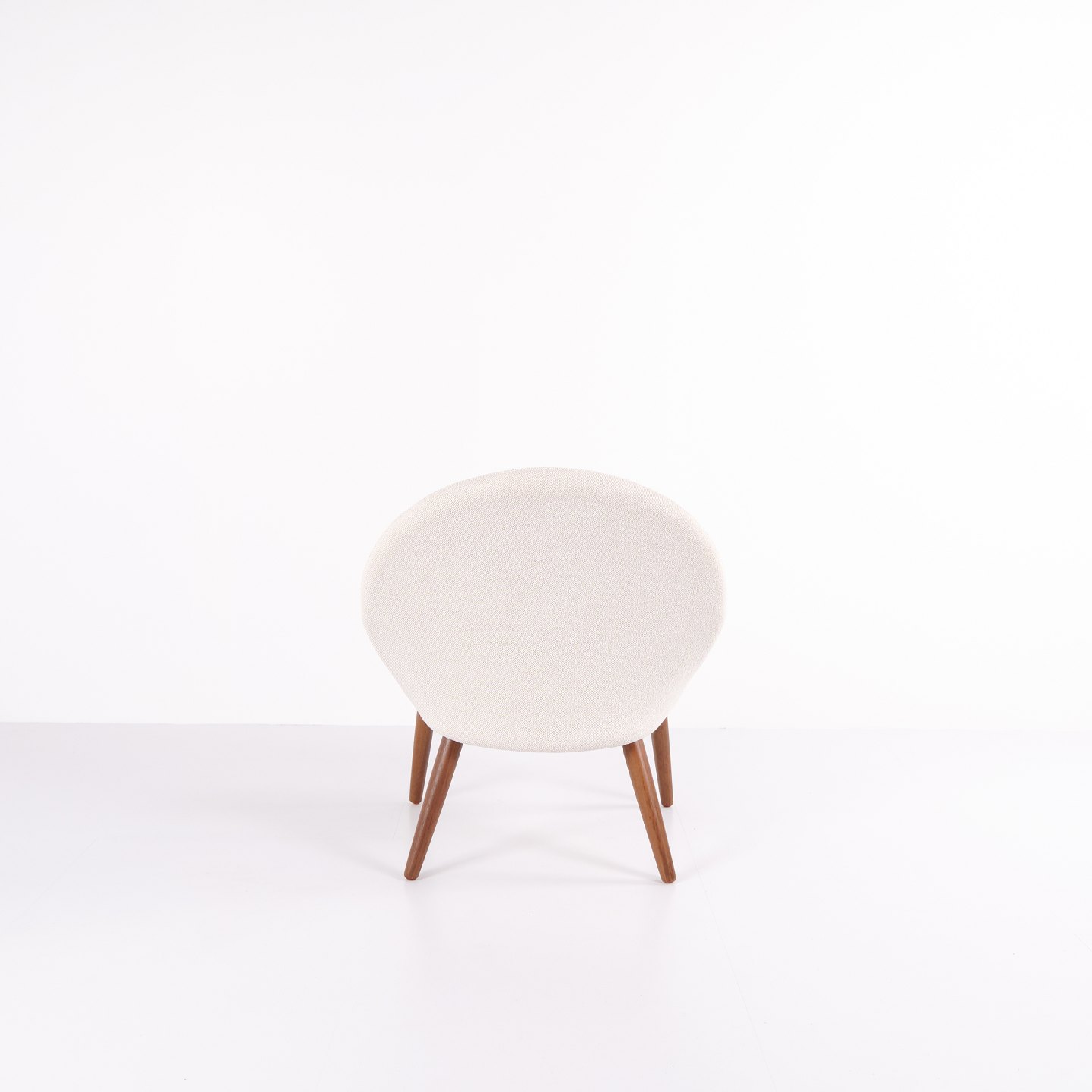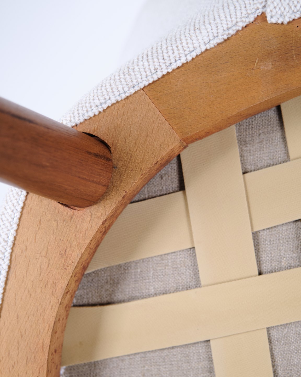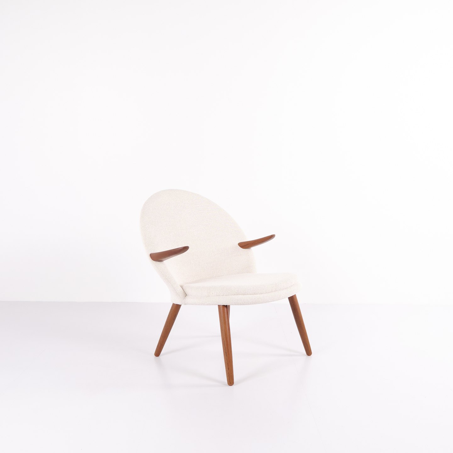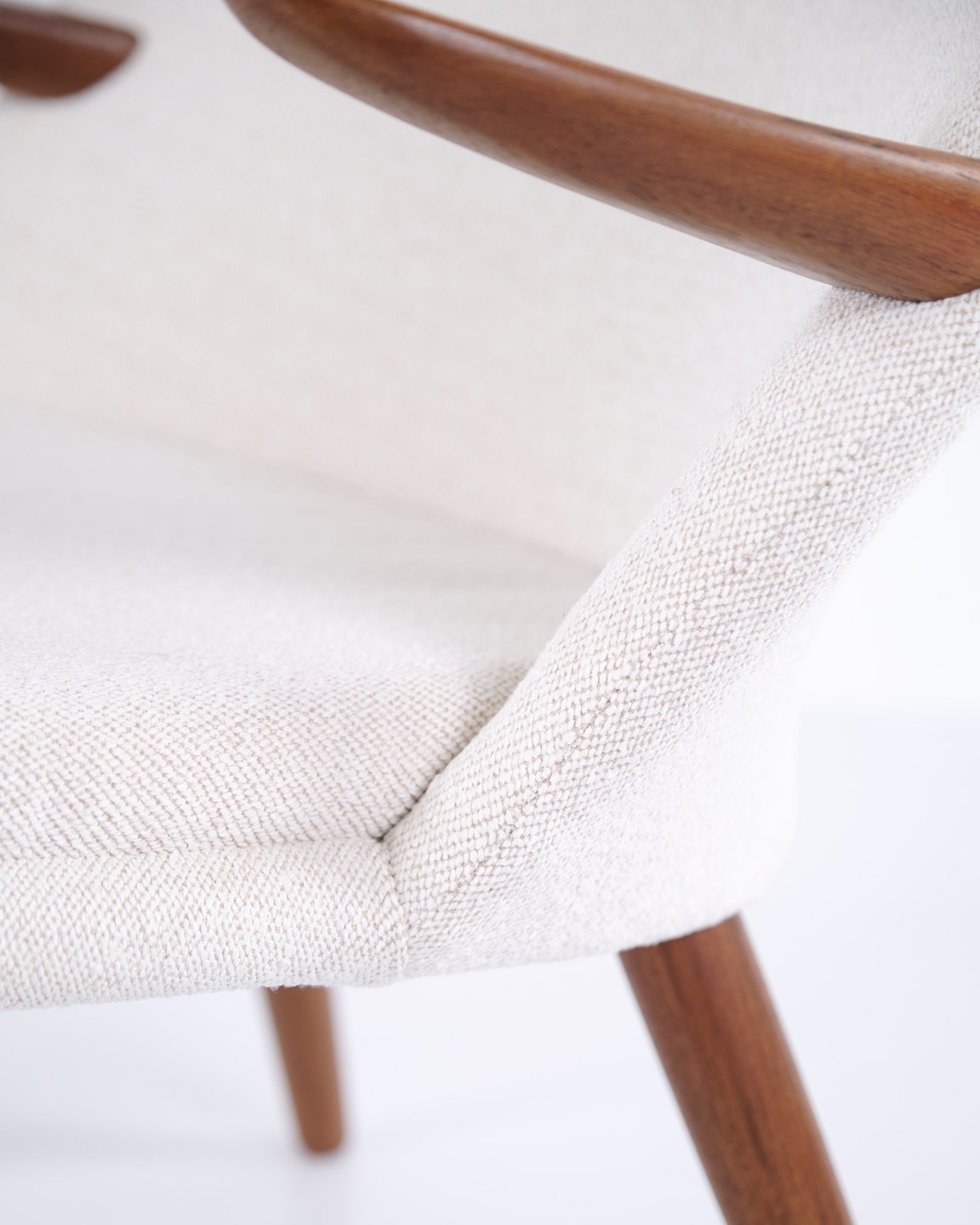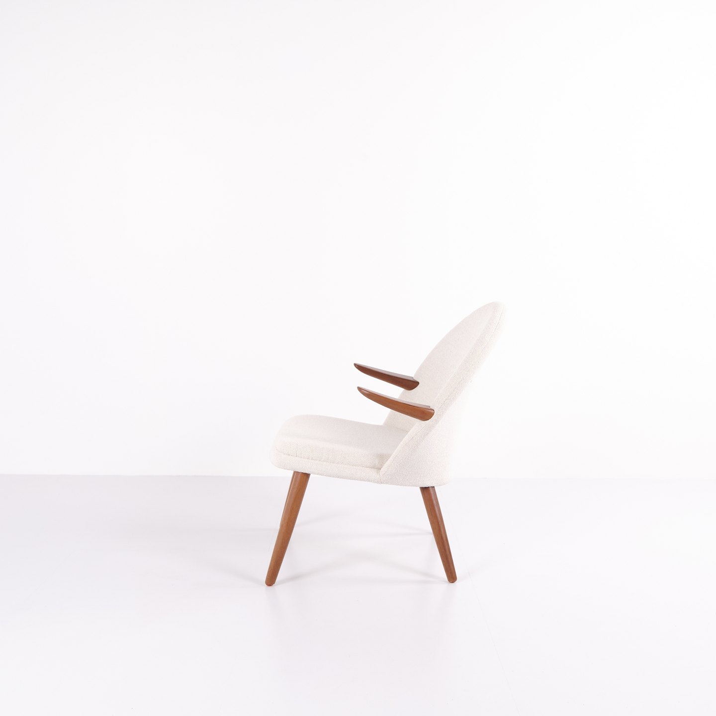Beskrivelse: Kurt Olsen lænestol fra Glostrup Møbelfabrik. Teaktræ med lyst stof, 1960’erne.