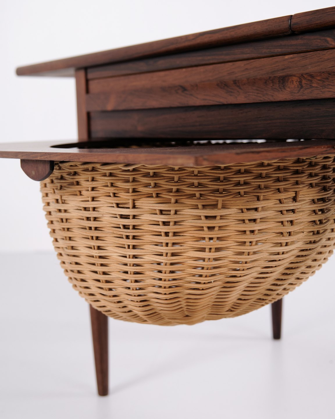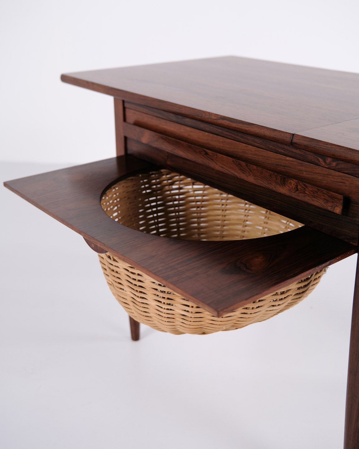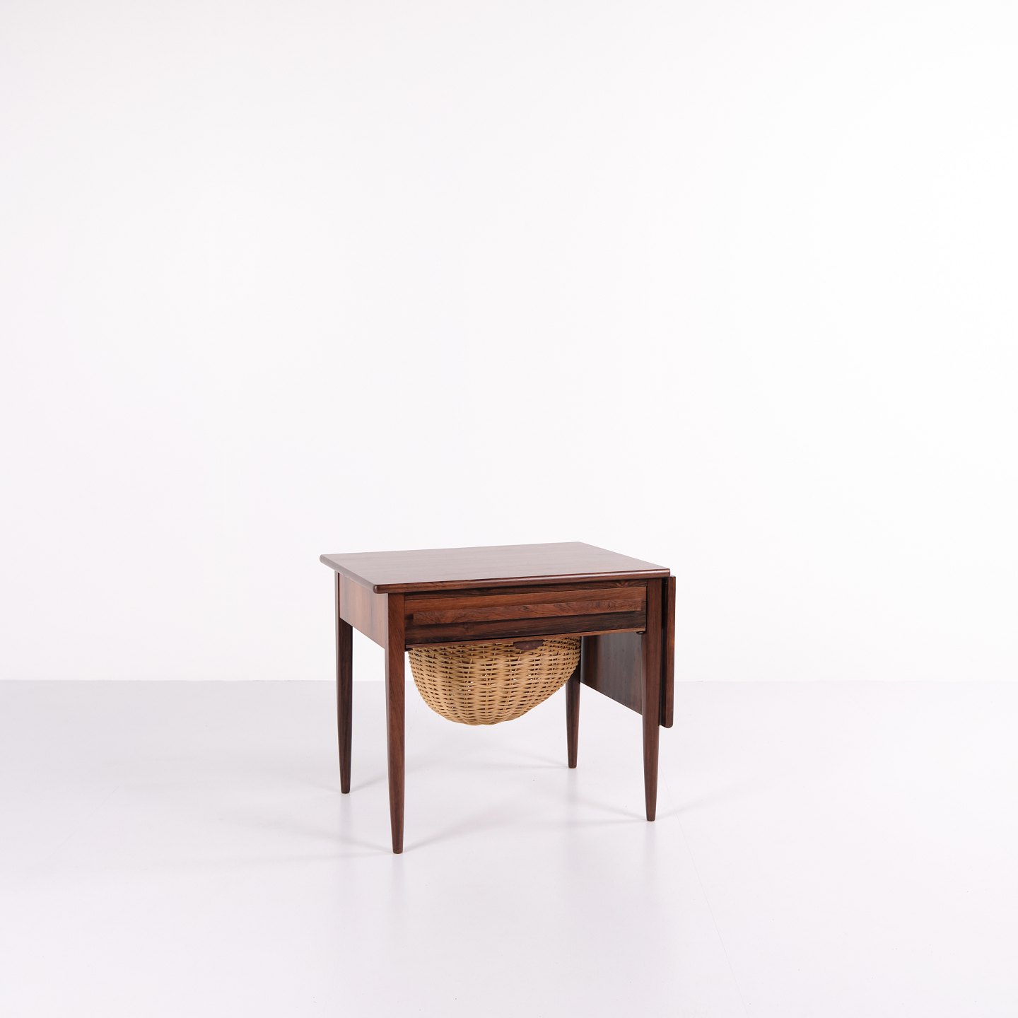 Beskrivelse: Foldbart sybord designet af Johannes Andersen og fremstillet af Silkeborg Møbelfabrik i 1960’erne. Bordet er udført i palisander og har både skuffe og udklappelig bordplade, hvilket gør det særligt funktionelt til opbevaring og arbejde.