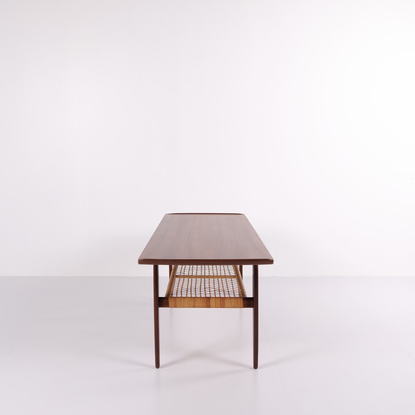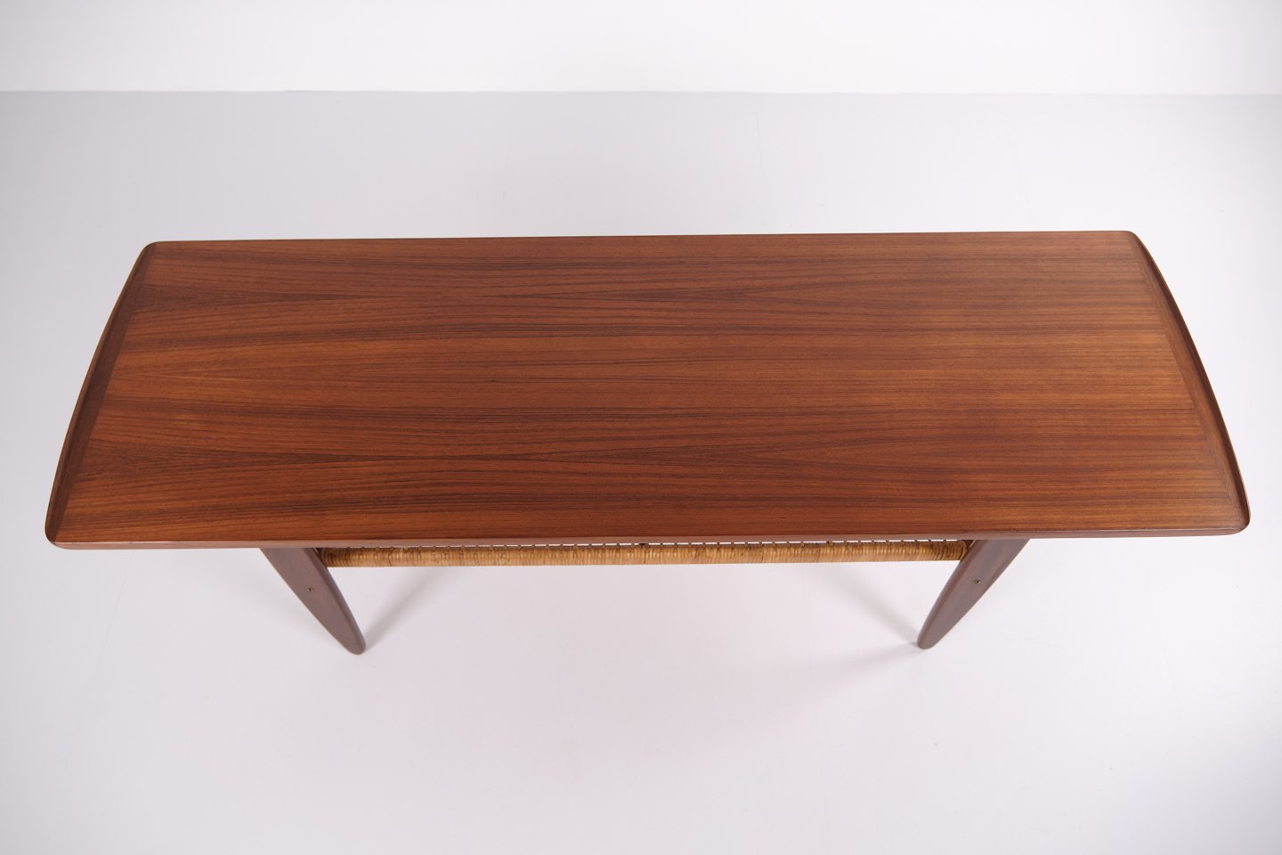 Beskrivelse: Sofabord udført i teaktræ med hylde lavet af sjeneflet fra 1960erne. Klassisk dansk design.