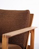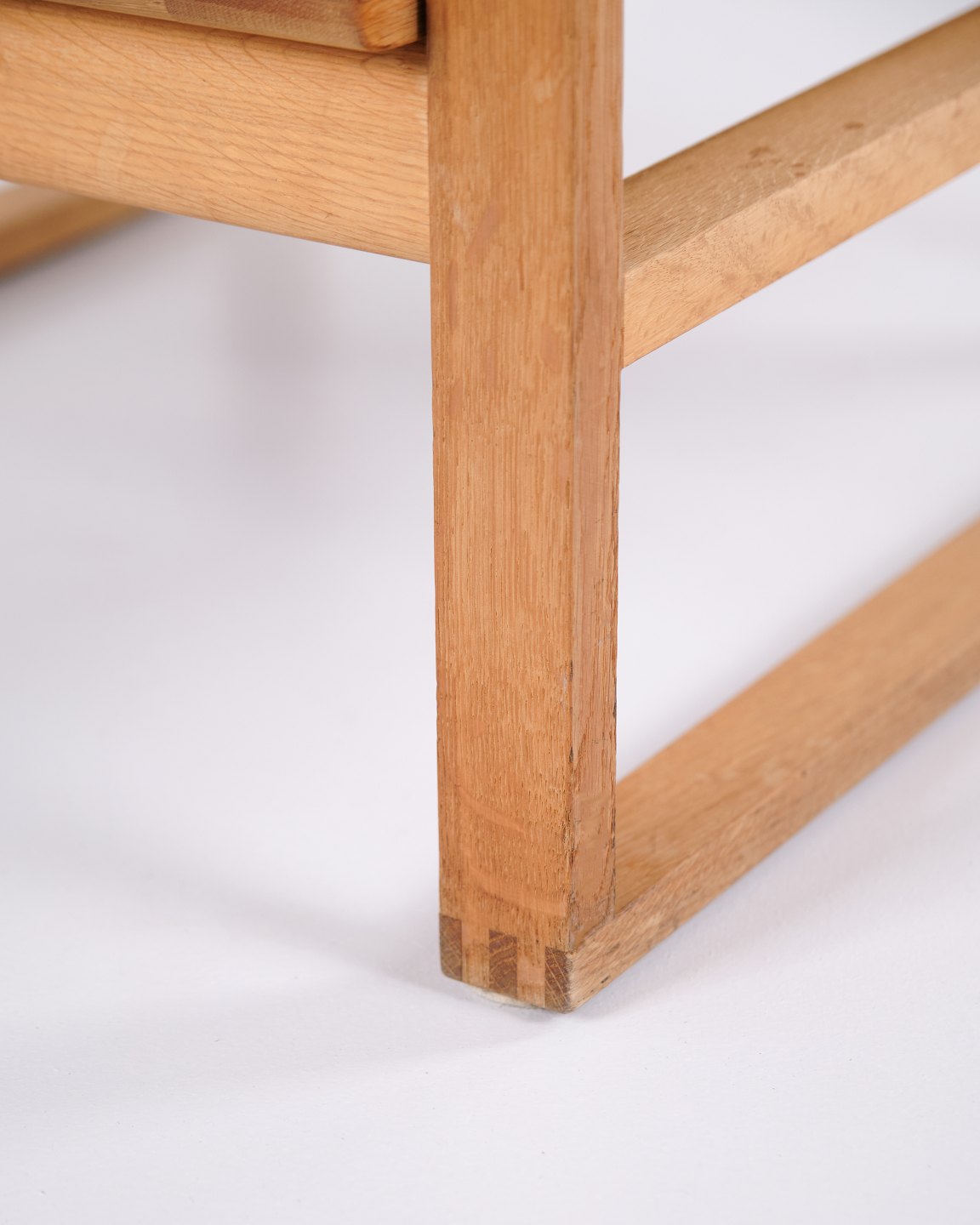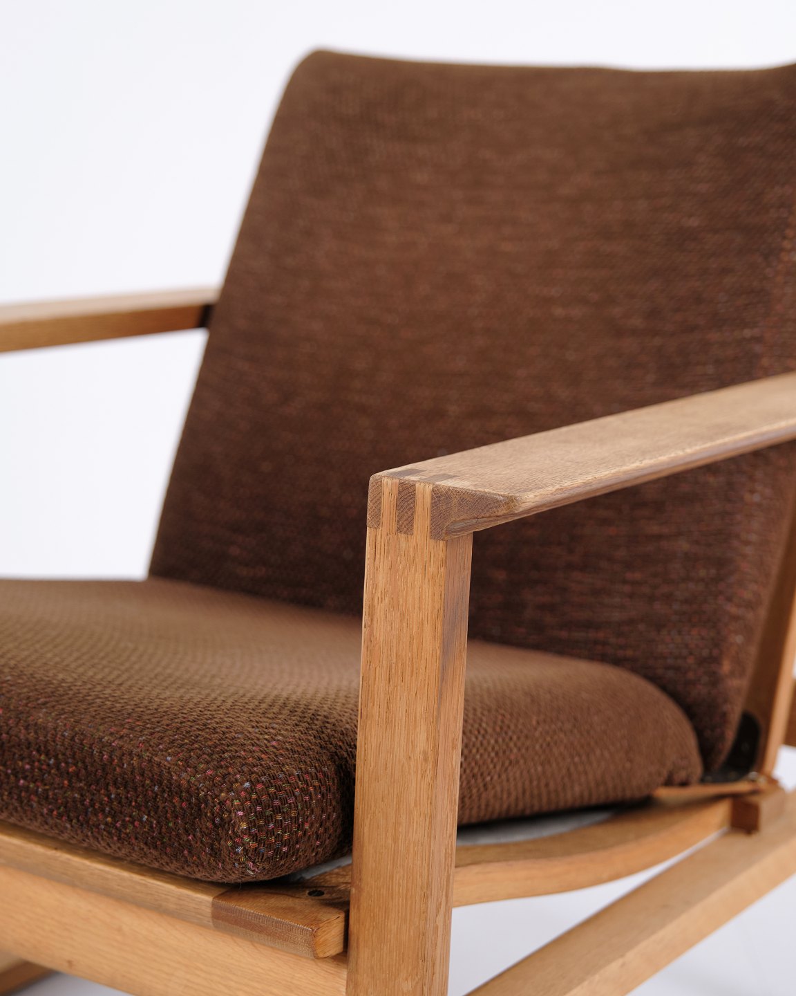 Beskrivelse: Børge Mogensen slædestol BM2256 fra Fredericia Stolefabrik. Egetræ med brune hynder.