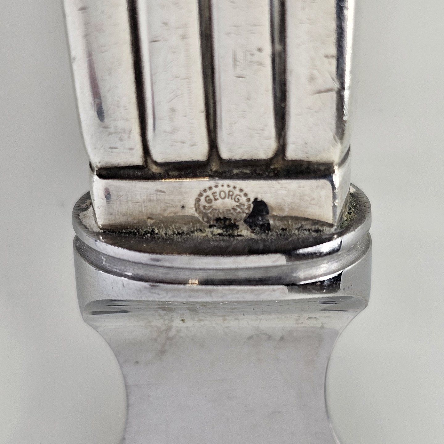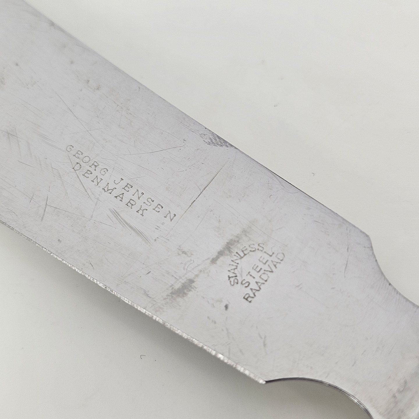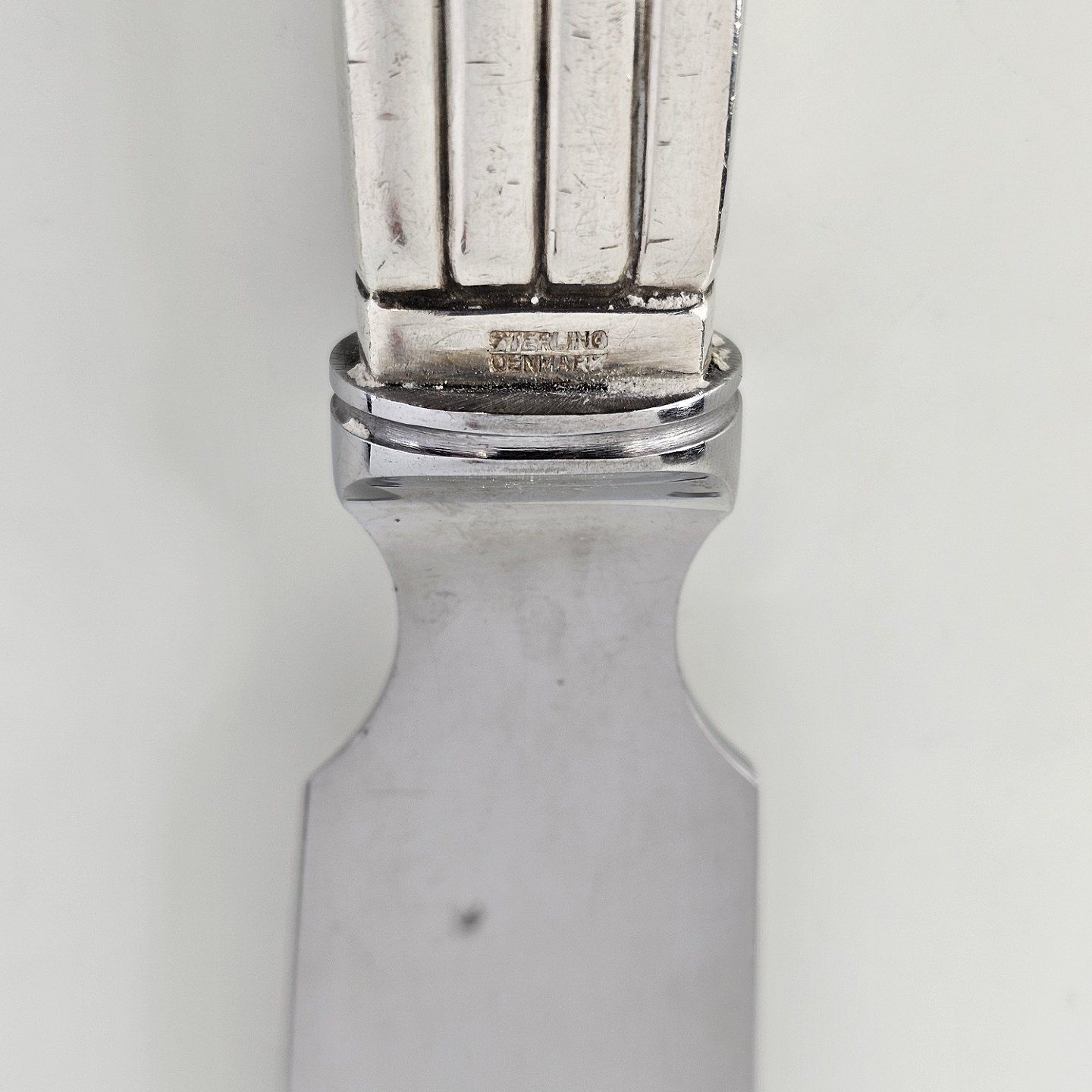 Beskrivelse: Bernadotte lagkagekniv i sterling sølv, med rustfrit stål skaft dekoreret med striber
