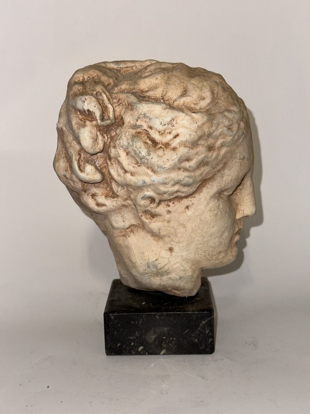 Beskrivelse: Skulptur i gips på sort sokkel. Forestillende Hygieia, der er den græske gudinde for sundhed, hygiejne og renlighed. Hygieia er datter af guden for medicin Asklepios.
