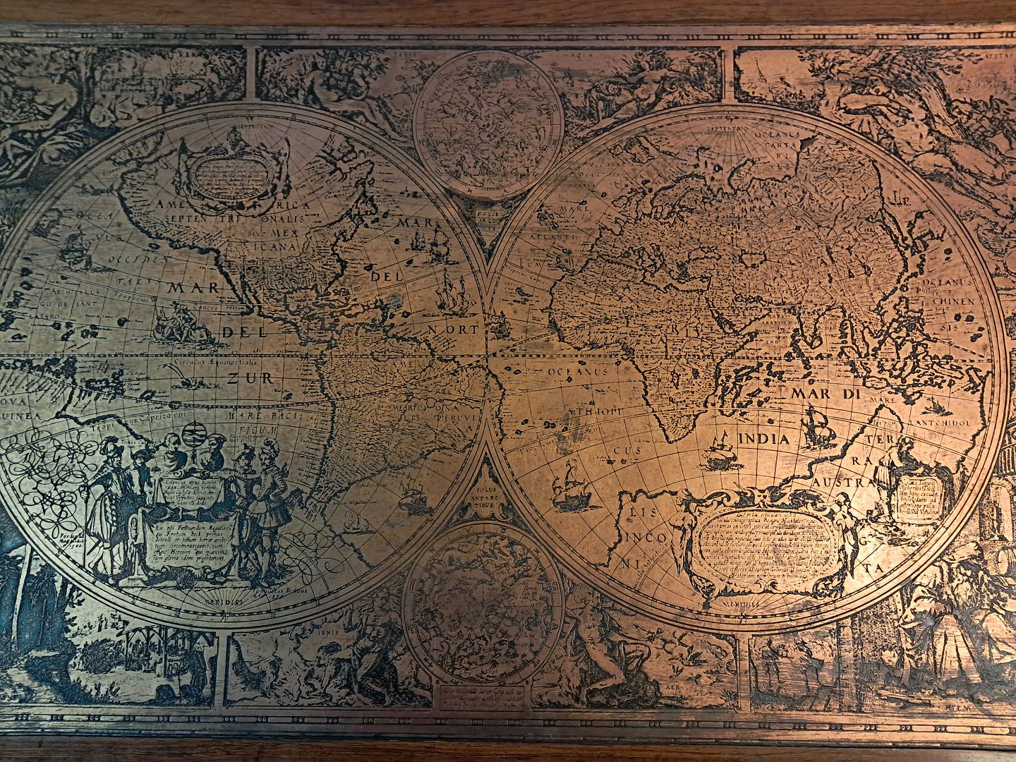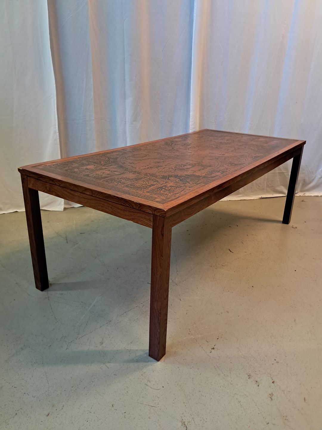 Beskrivelse: Sofabord i fineret palisander med verdenskort på metalplade, fra 1970erne.