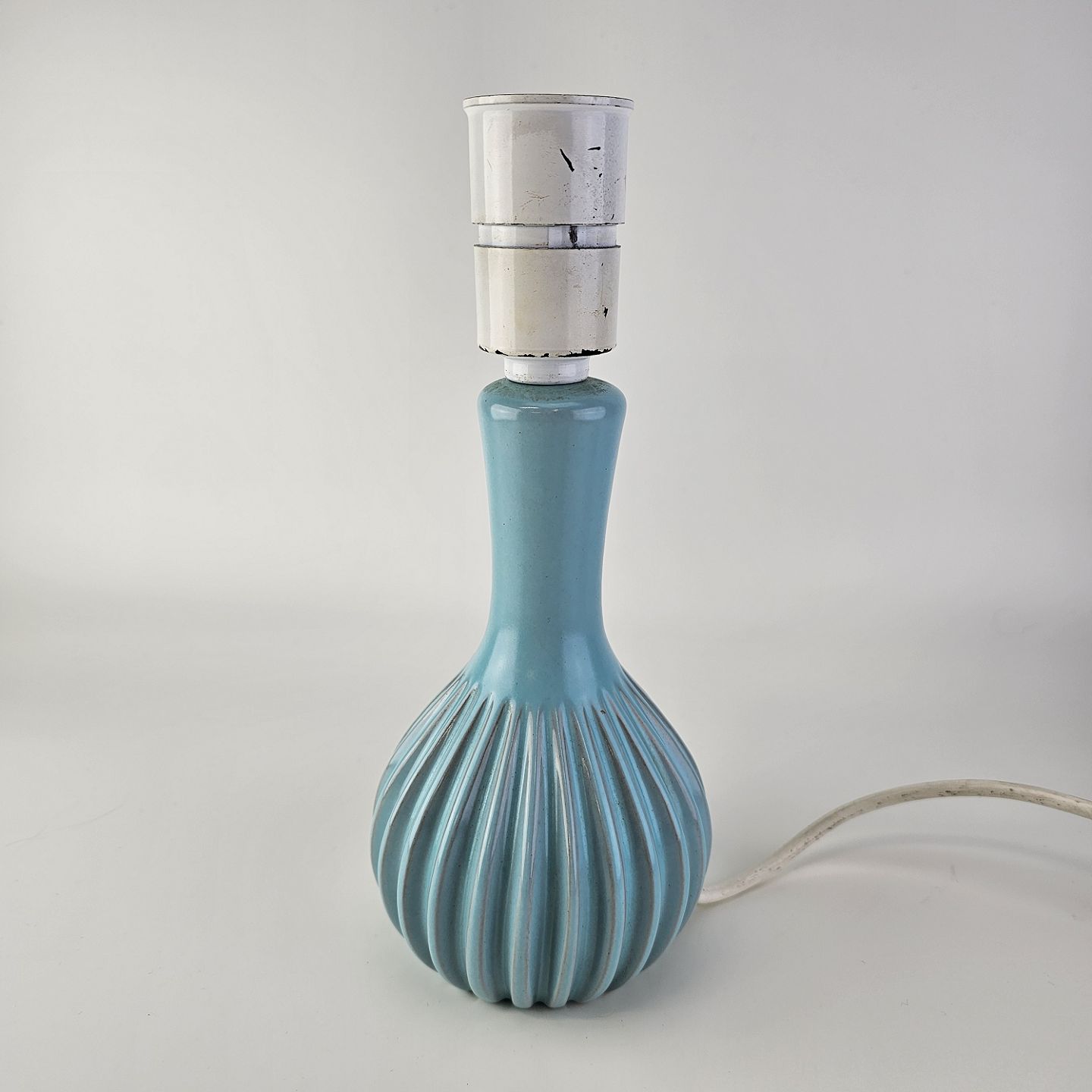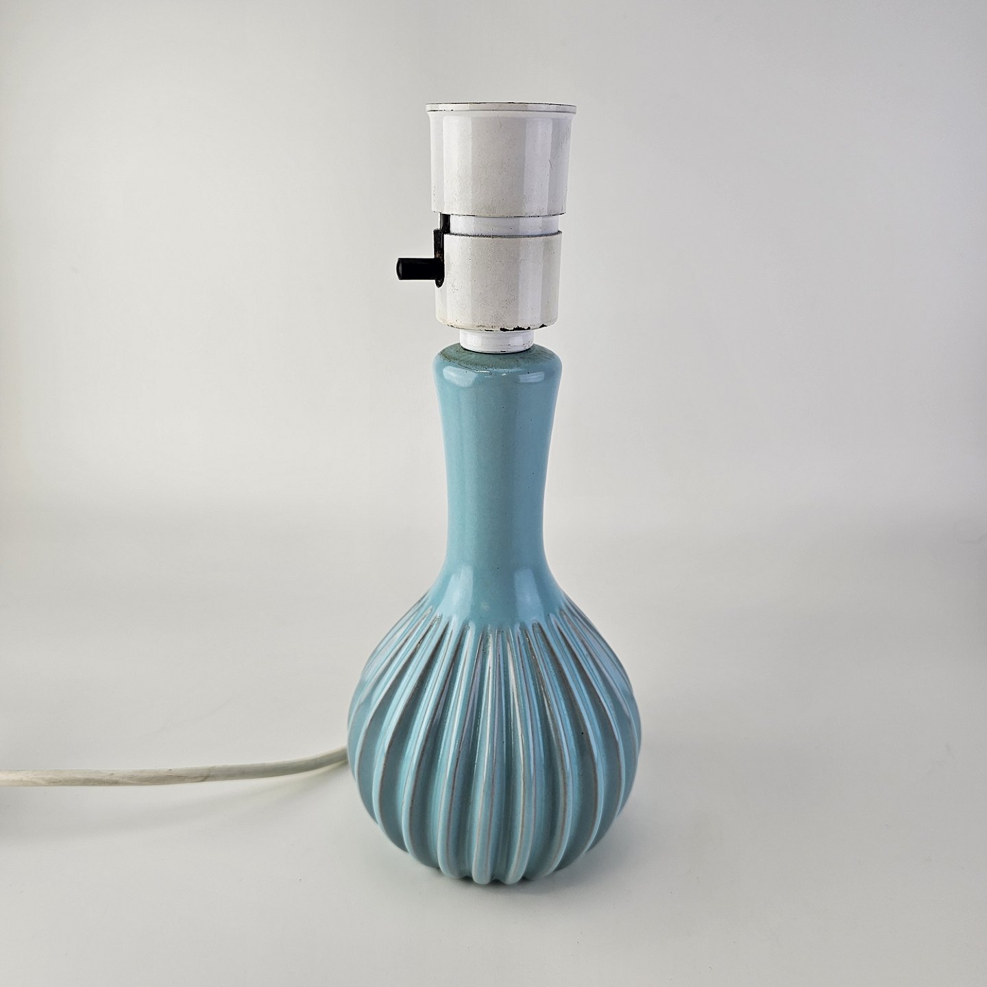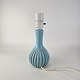Beskrivelse: Rund bordlampe i rillet grønblå keramik med hvid fatning
