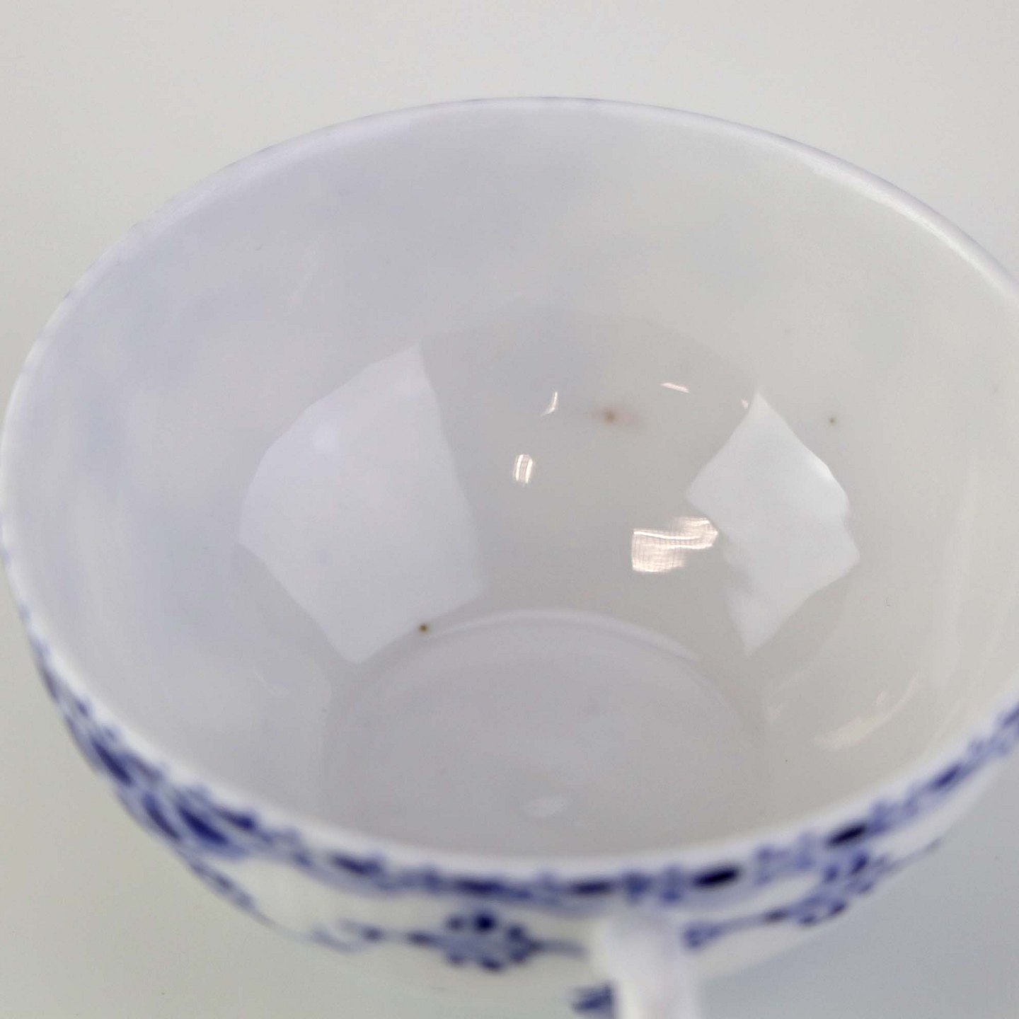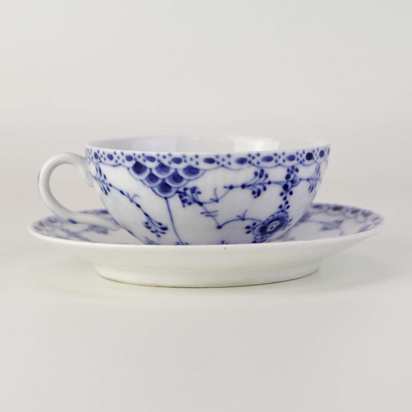Beskrivelse: Lille tekop med underkop i kongeligt porcelæn fra stellet Musselmalet Halvblonde. Nr. 1/523 og 1/527-528