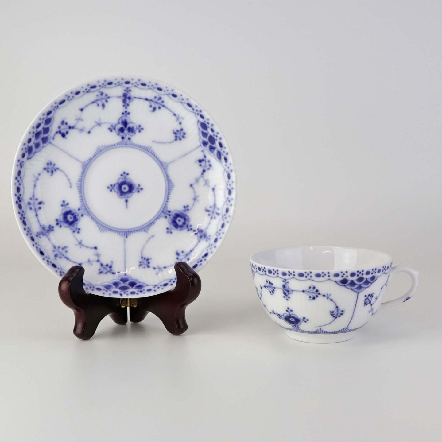 Beskrivelse: Mellemstor tekop med underkop i kongeligt porcelæn fra stellet Musselmalet Halvblonde. Nr. 1/713