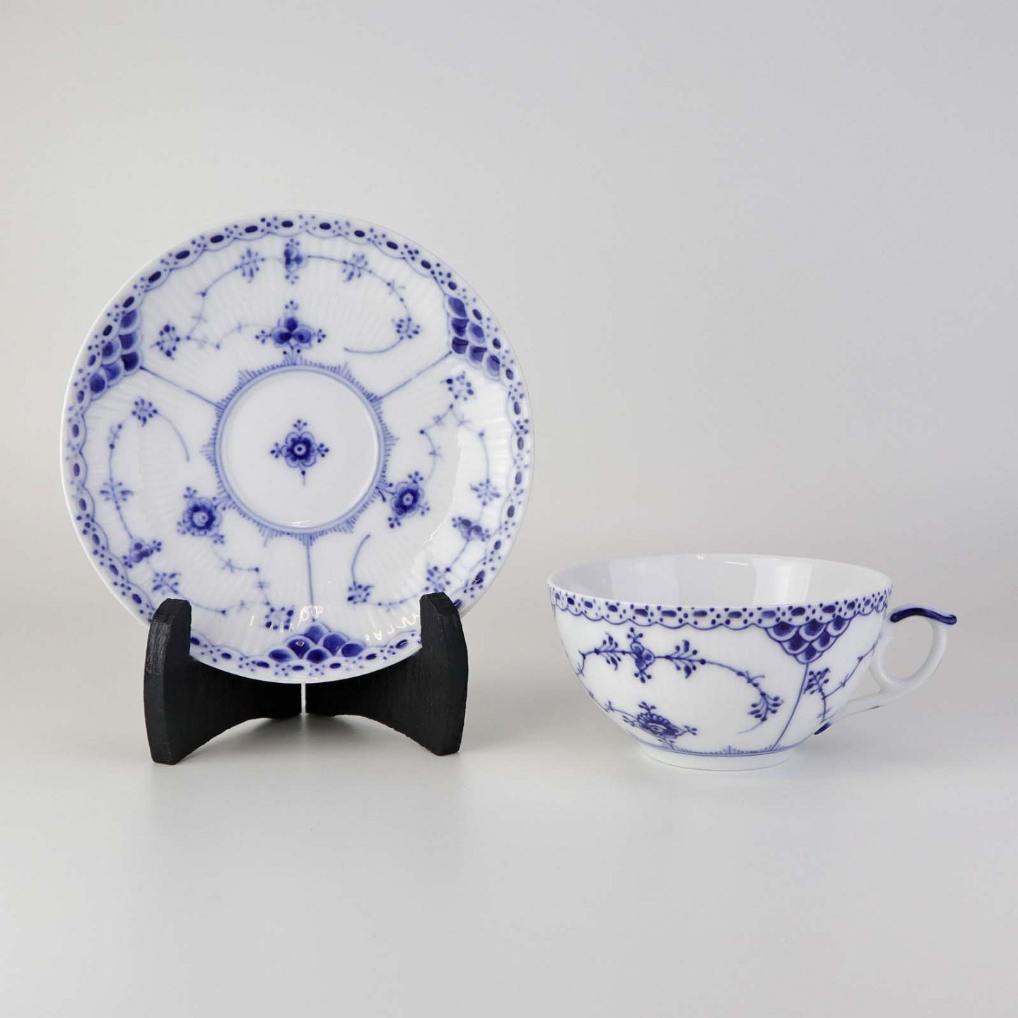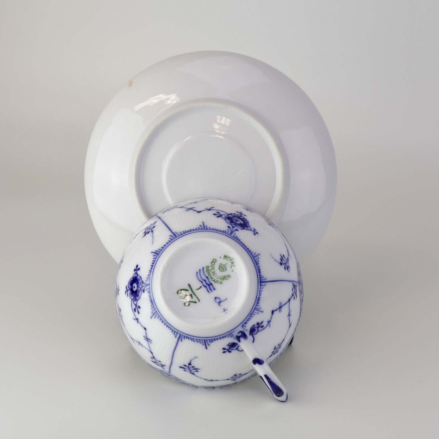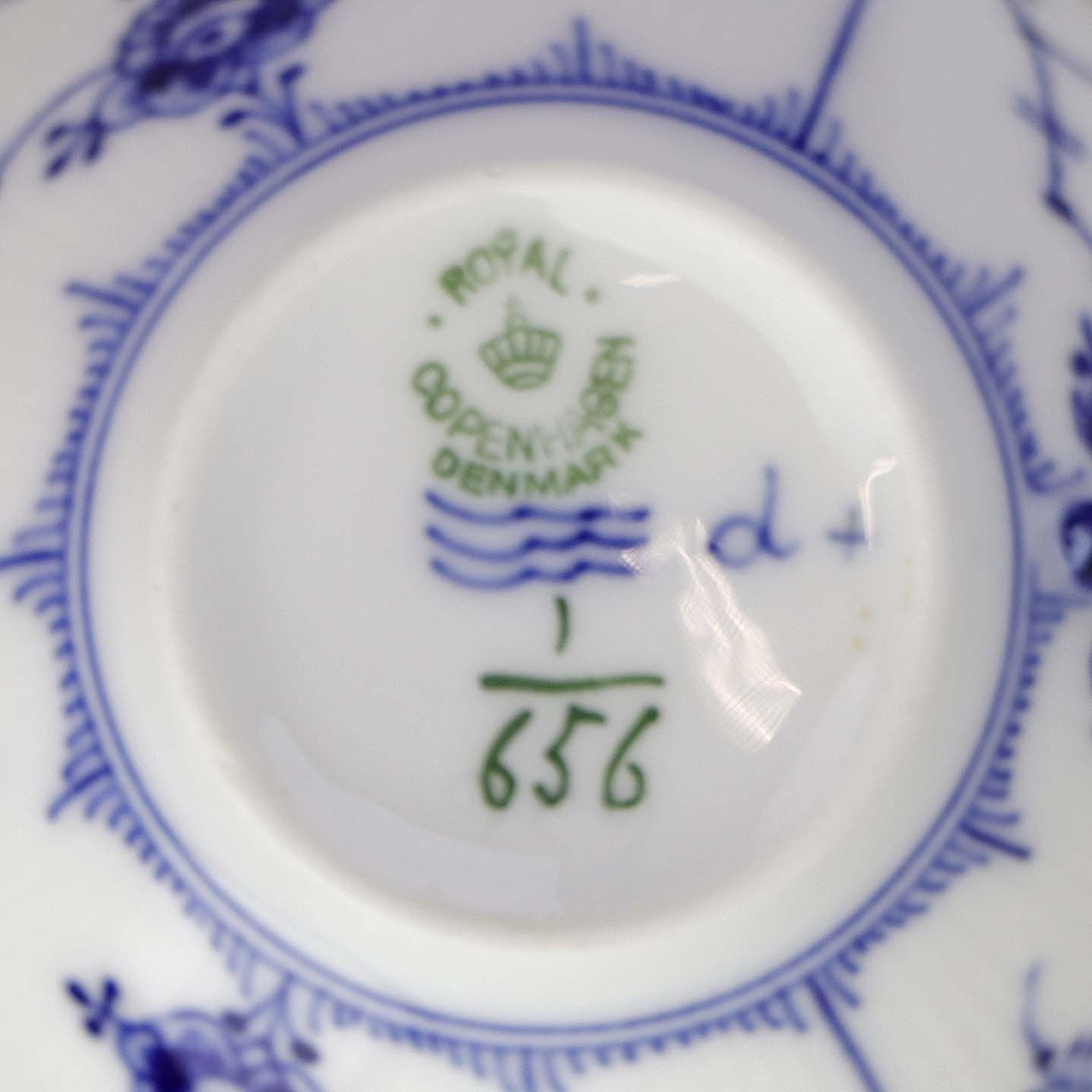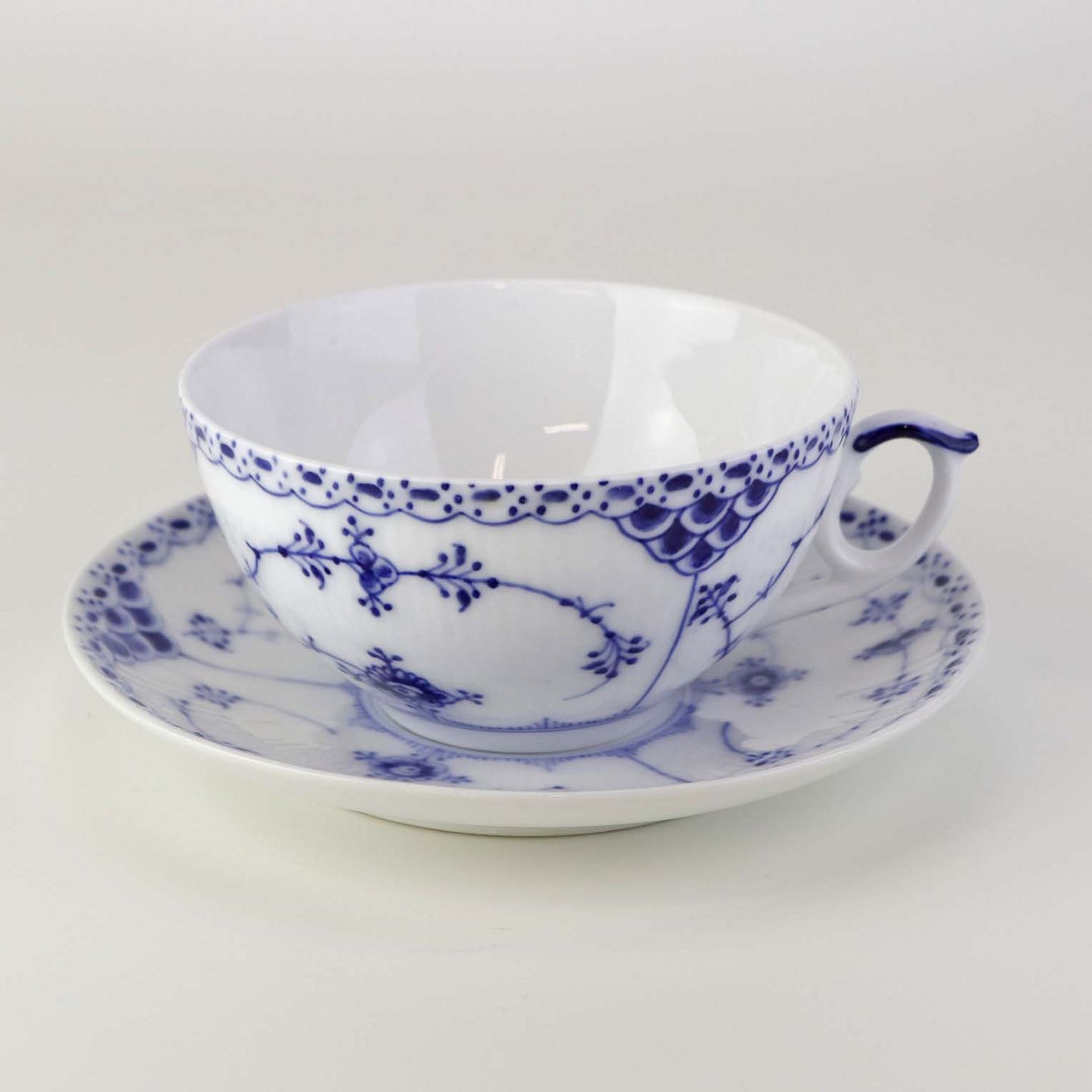 Beskrivelse: Stor tekop med underkop i kongeligt porcelæn fra stellet Musselmalet Halvblonde. Nr. 1/656 og 1/626