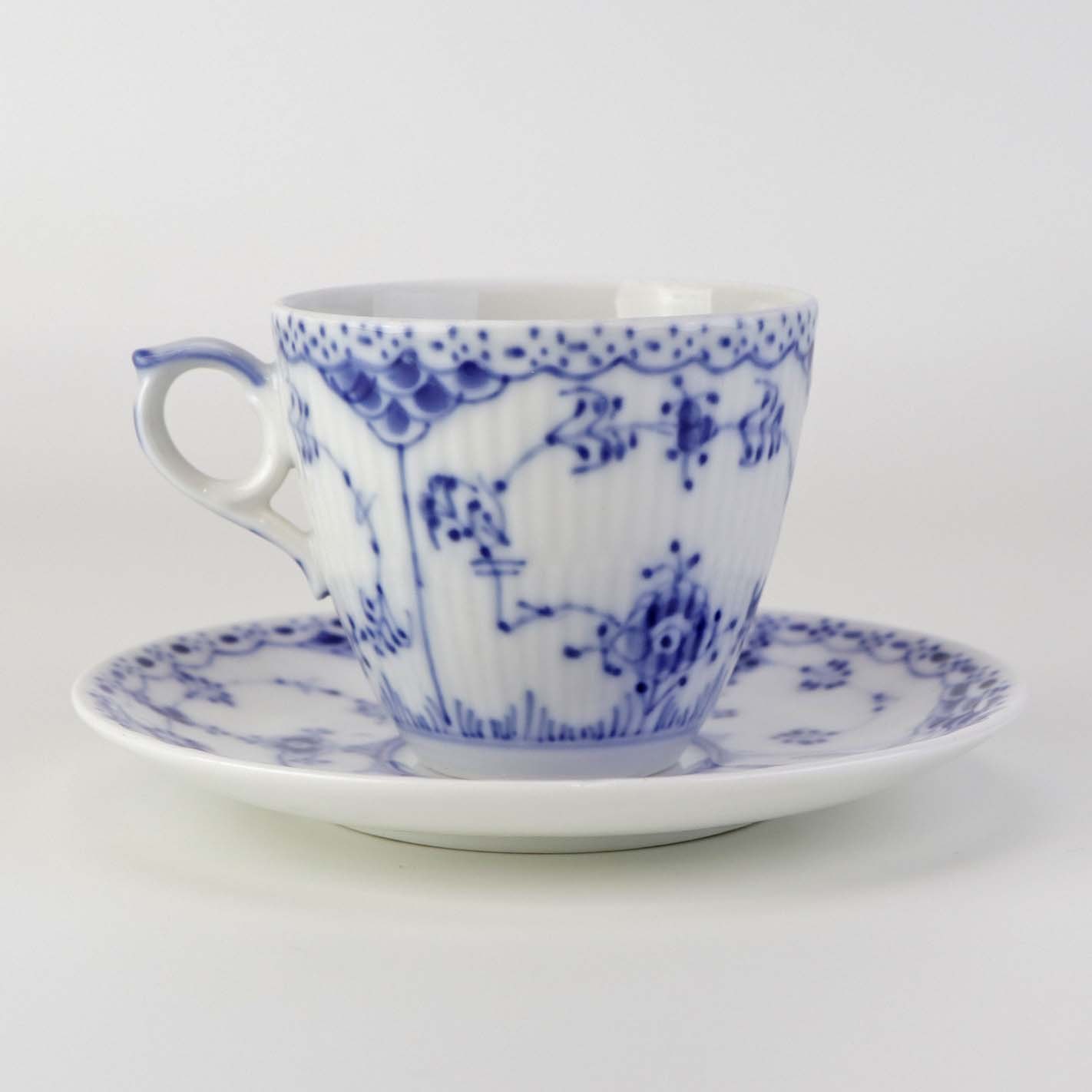 Beskrivelse: Mellemstor kaffekop med underkop i kongeligt porcelæn fra stellet Musselmalet Halvblonde. Nr. 1/719