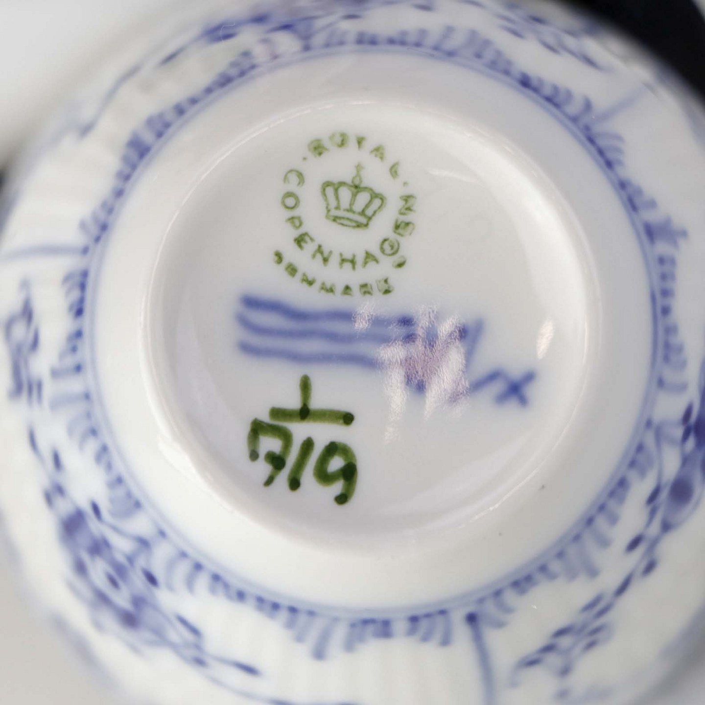Fremstår med to blå pletter på underkoppens bagside.