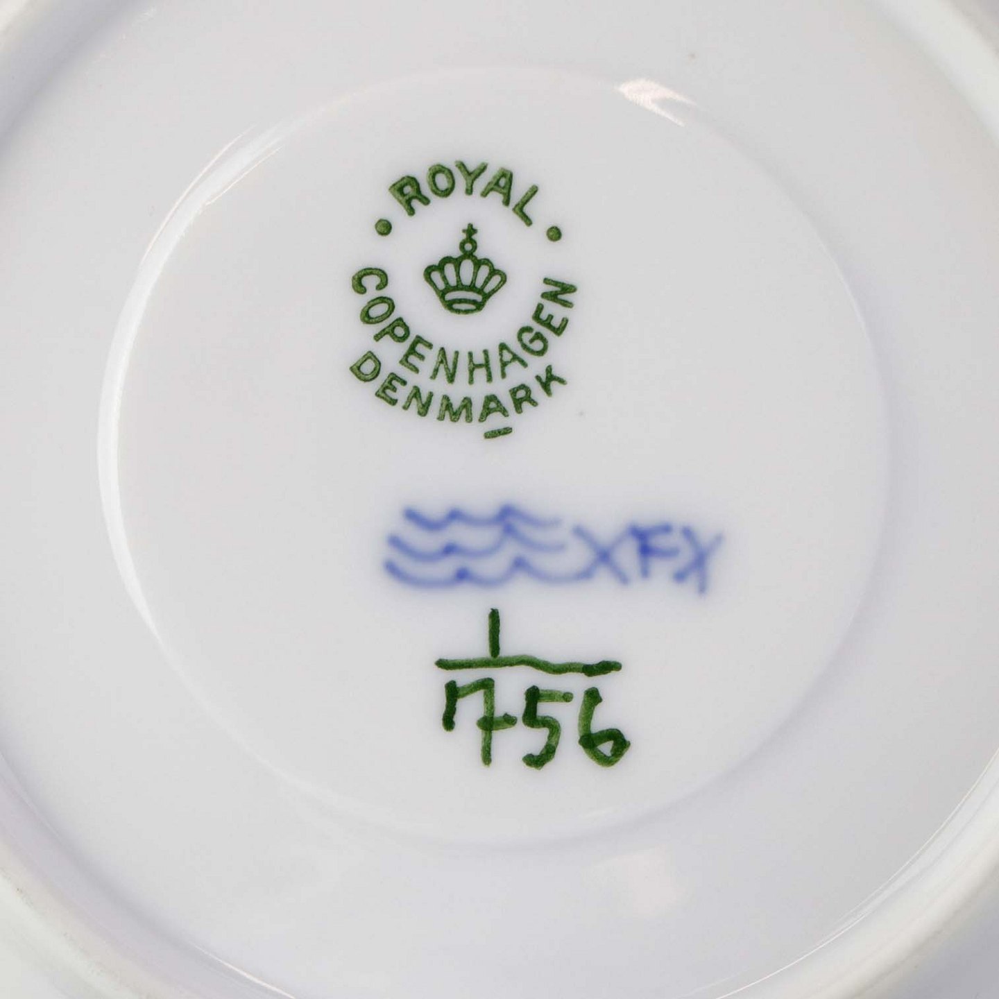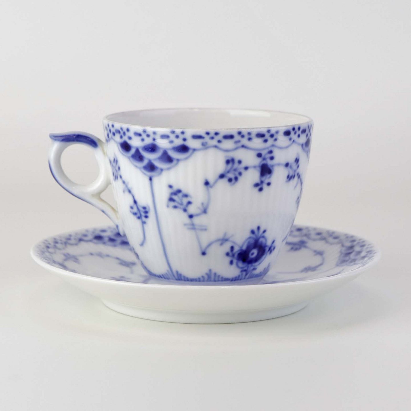 Beskrivelse: Stor kaffekop med underkop i kongeligt porcelæn fra stellet Musselmalet Halvblonde. Nr. 1/756