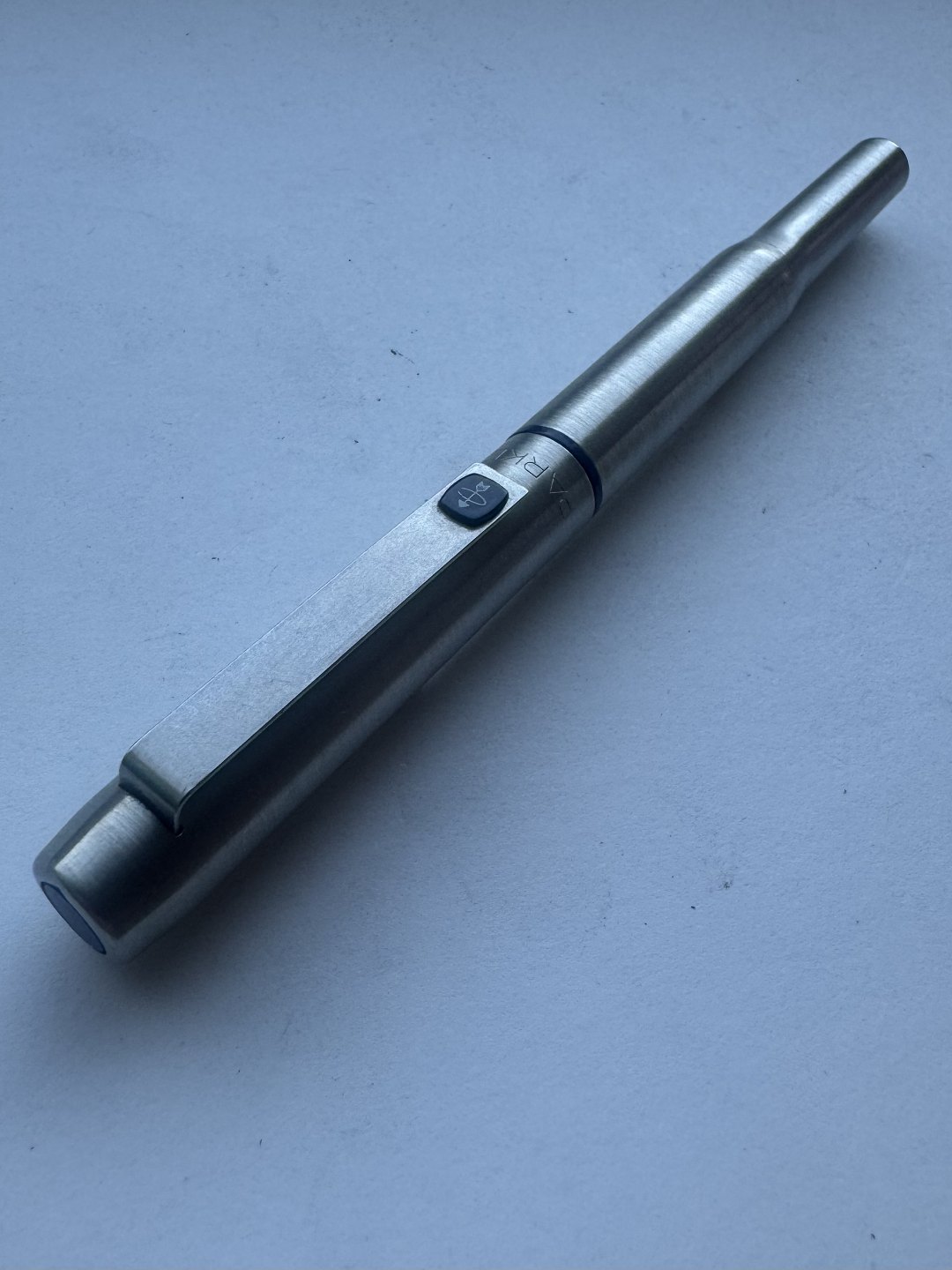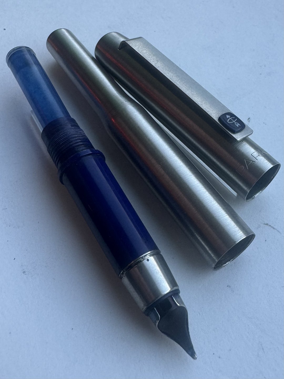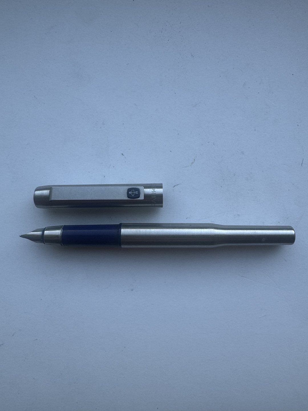 Beskrivelse: Parker 25 fyldepen i stål fremstillet fra midt i 1970’erne i England. Fremstår i god og skriveklar stand, når der bliver indsat en ny refill blækpatron. 13,2 cm lang.