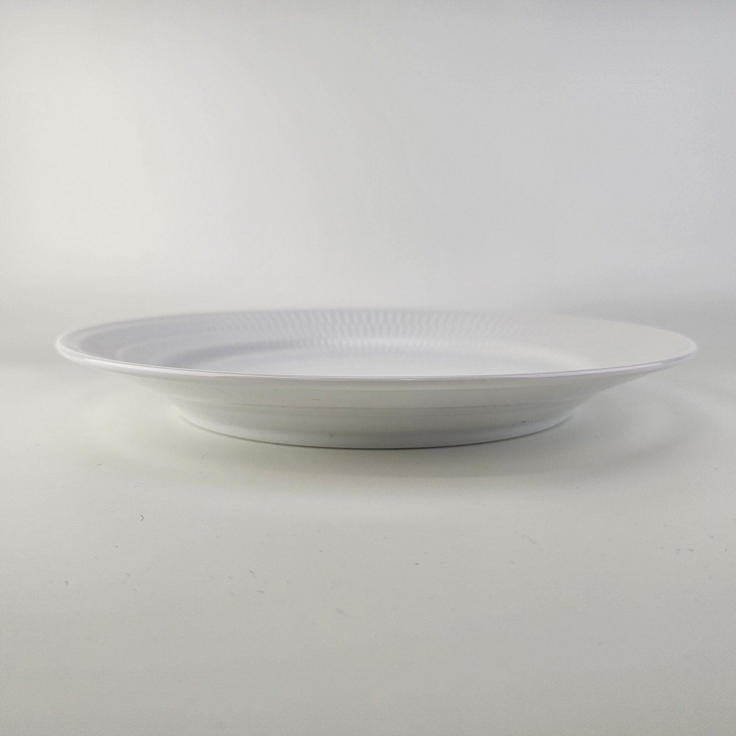 Beskrivelse: Flad middagstallerken i kongeligt porcelæn fra stellet Hvid Riflet