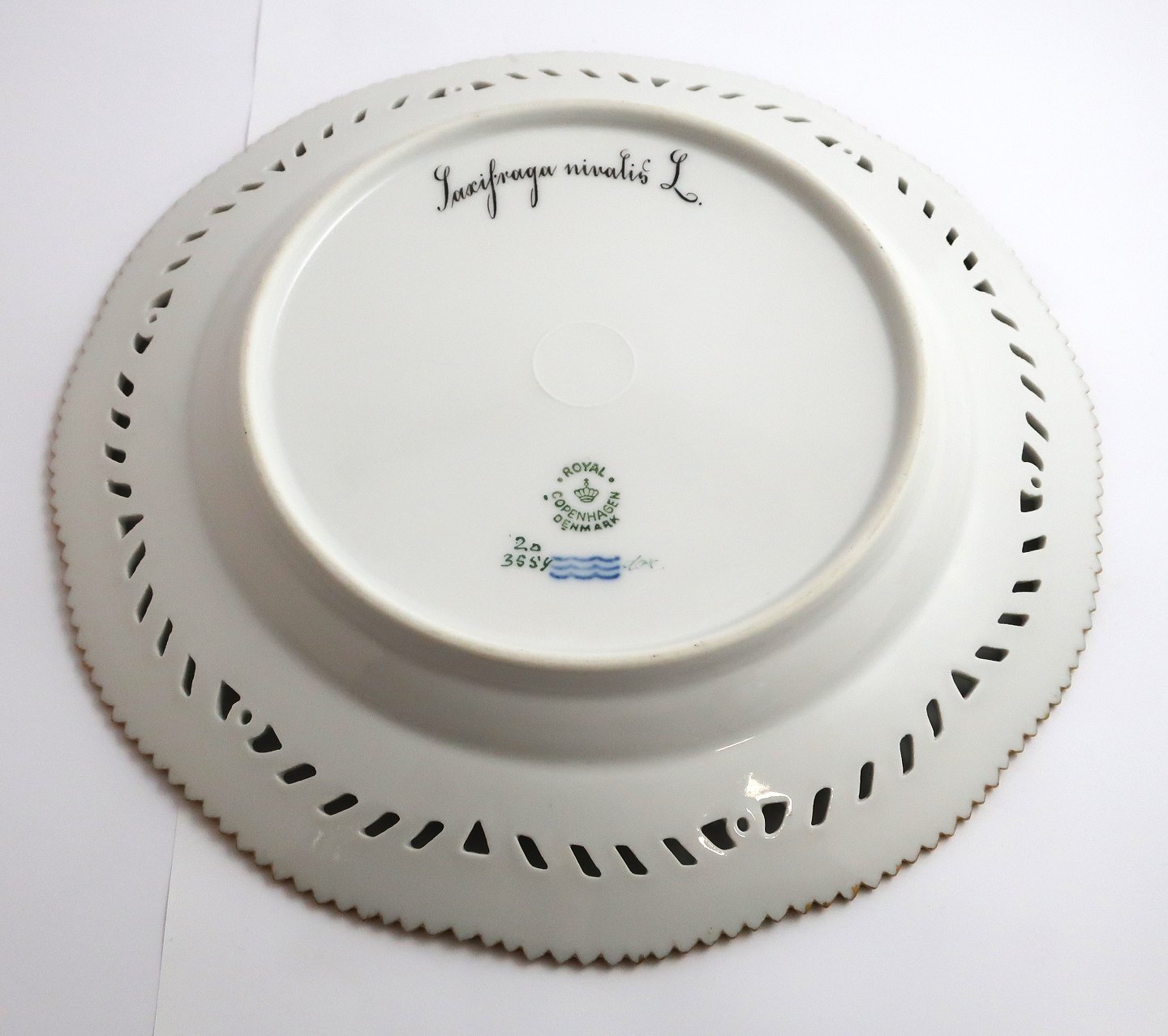 Royal Copenhagen, Flora Danica. Frokost tallerken med gennemskåret bort. Design #3554. Diameter 23 cm. (1 sortering). Saxifraga nivalis L