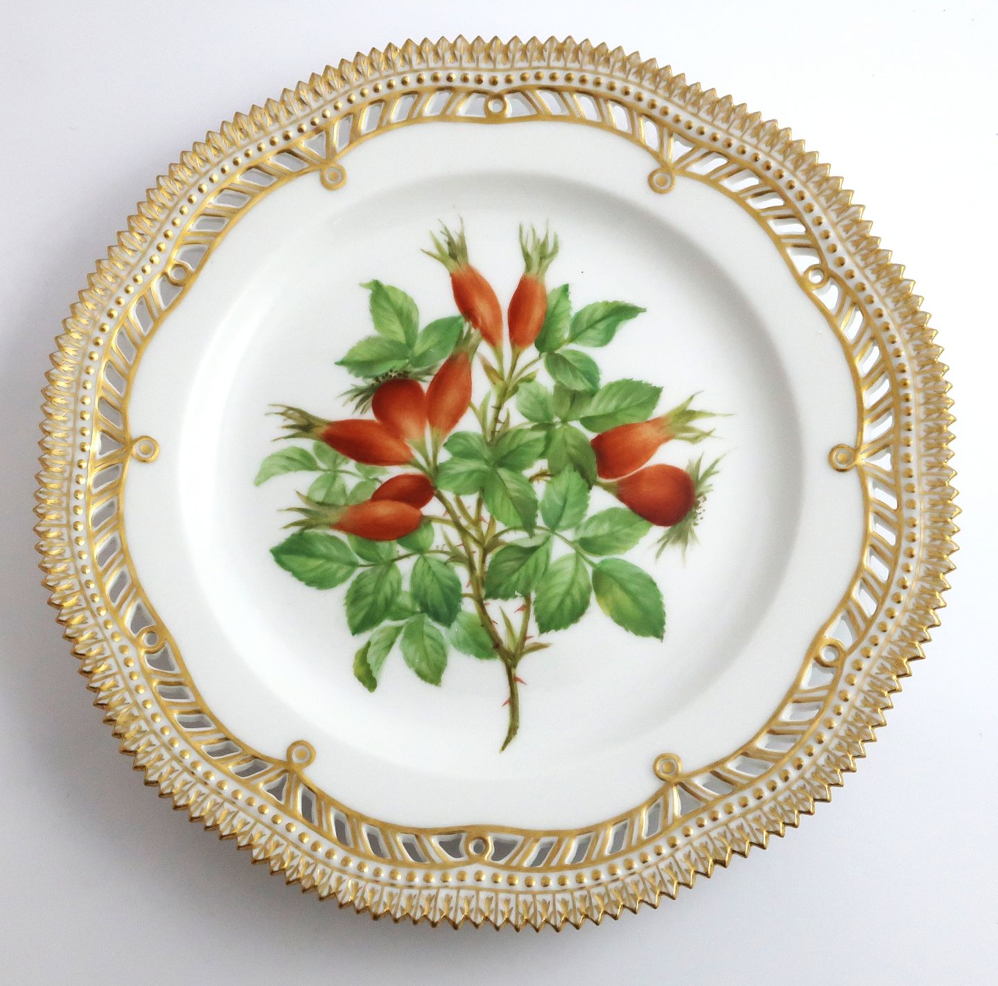 Royal Copenhagen, Flora Danica, frugttallerken. Frokost tallerken med gennemskåret bort. Design #429/3554. Diameter 23 cm. (1 sortering).