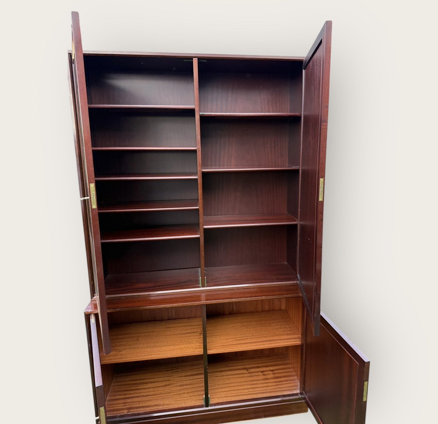 Beskrivelse: Stort rummeligt skab med hylder, mahognifiner, Mål: HxBXD 186x110x38cm *Pæn stand med enkelte brugsspor*