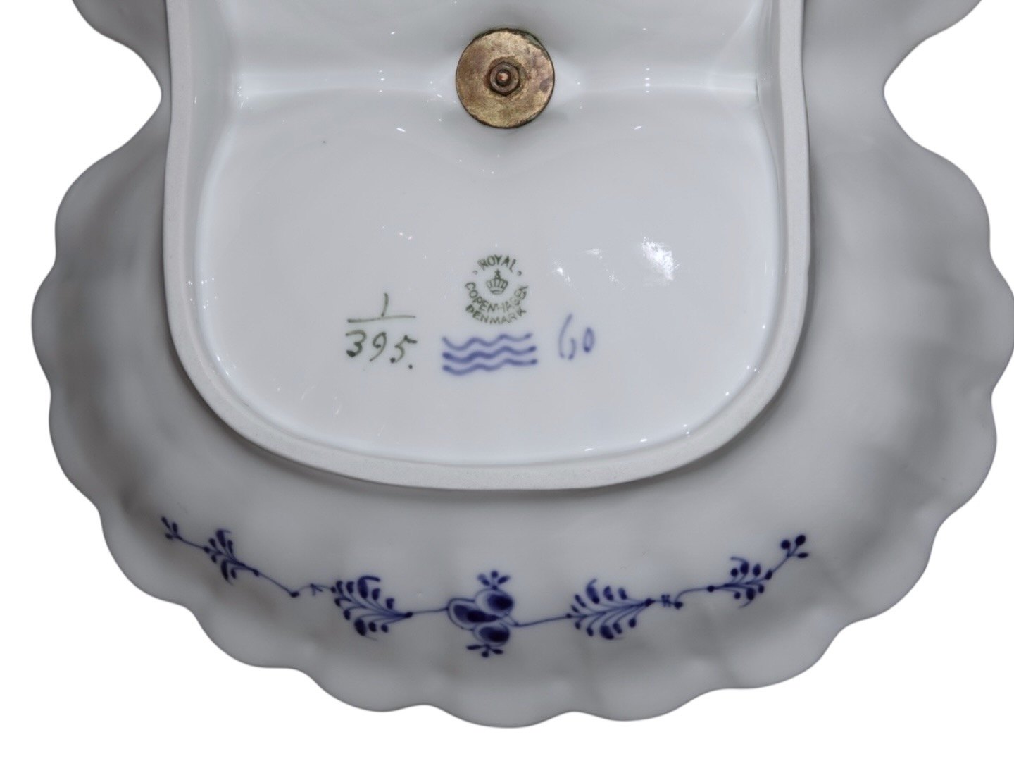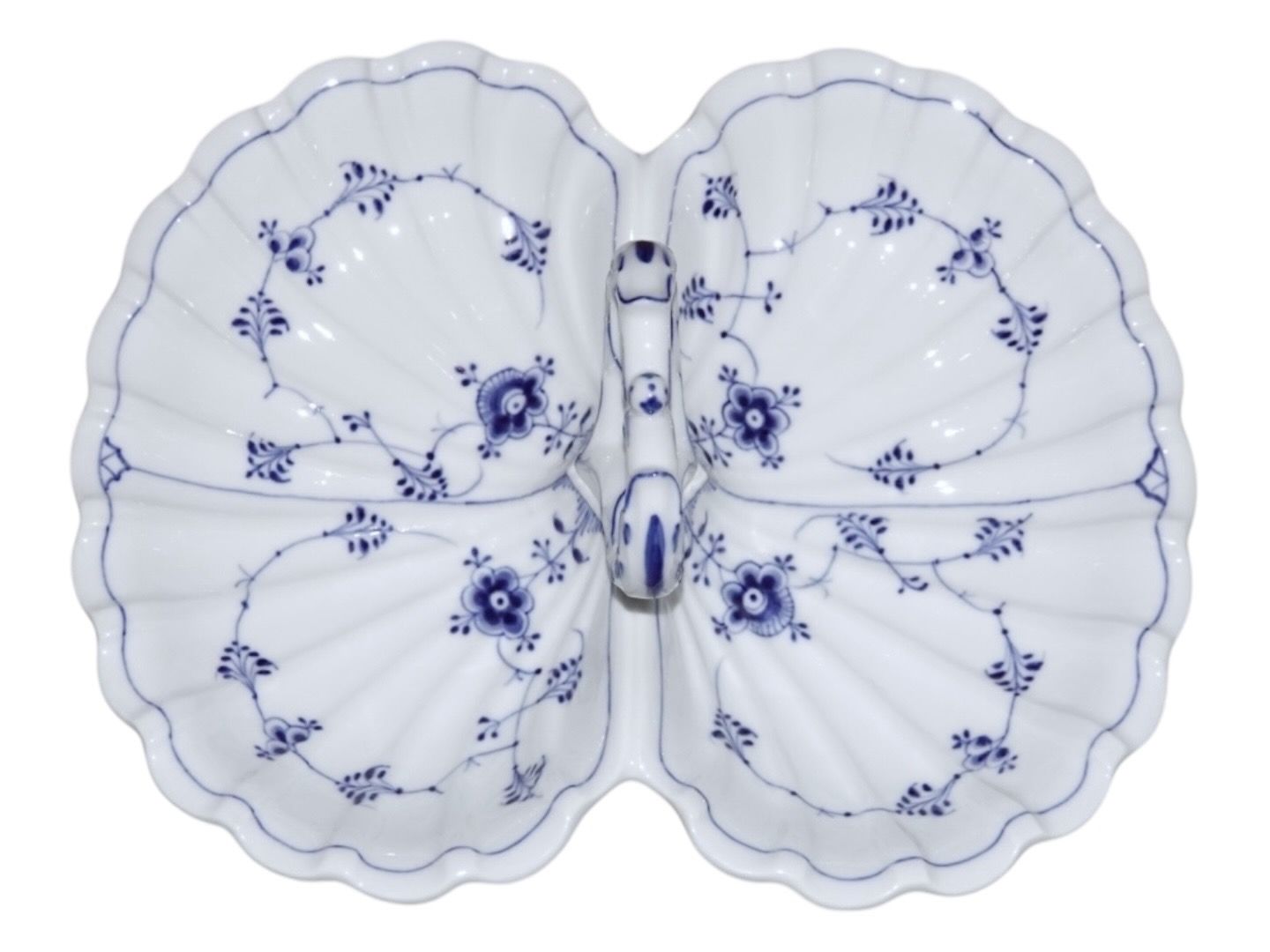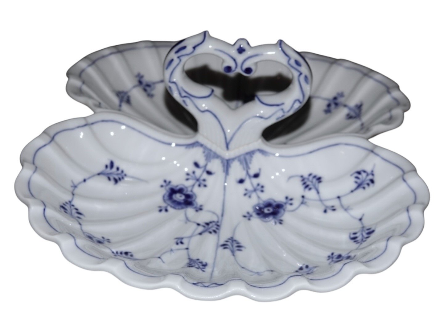 Beskrivelse: Royal Copenhagen Musselmalet Riflet, to-delt cabaretfad med hank.