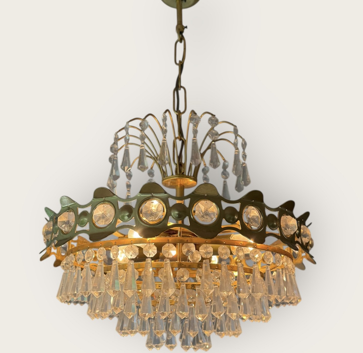 Beskrivelse: Lysekrone i messing med mange glasprismer, fungere fint og med alle prismer, Diameter ca. 36cm *Pæn brugt stand*