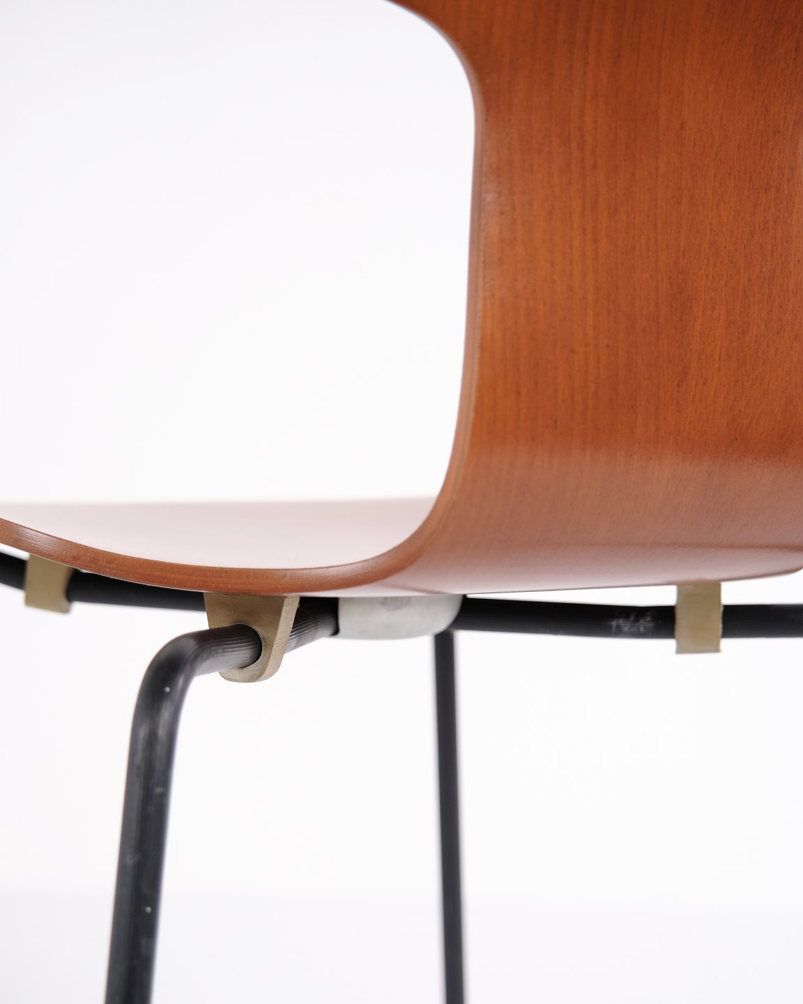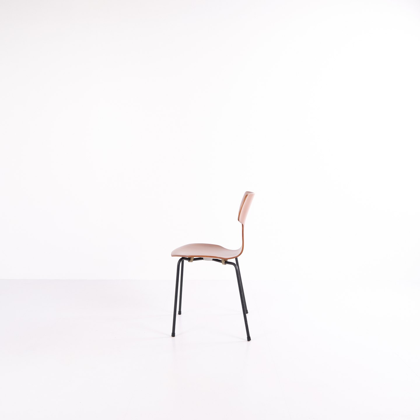 Beskrivelse: Sæt af seks spisestuestole, model 3103, også kaldet T-stolen eller Hammerstolen, fra Fritz Hansen. Stolene er professionelt behandlet og restaureret på vores værksted og fremstår i flot stand. Udstyret med originale Fritz Hansen- og Danish Control-labels, som dokumenterer ægthed og produktion.