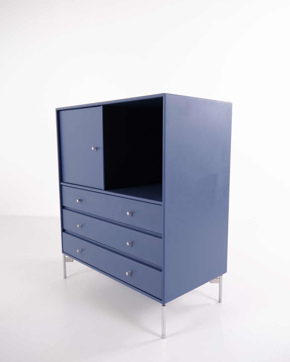 Beskrivelse: Montana kommode i blå med krom ben. Modulet er indrettet med tre skuffer og én låge, hvilket giver praktisk og fleksibel opbevaring. Et klassisk Montana-design med enkel struktur og høj funktionalitet.