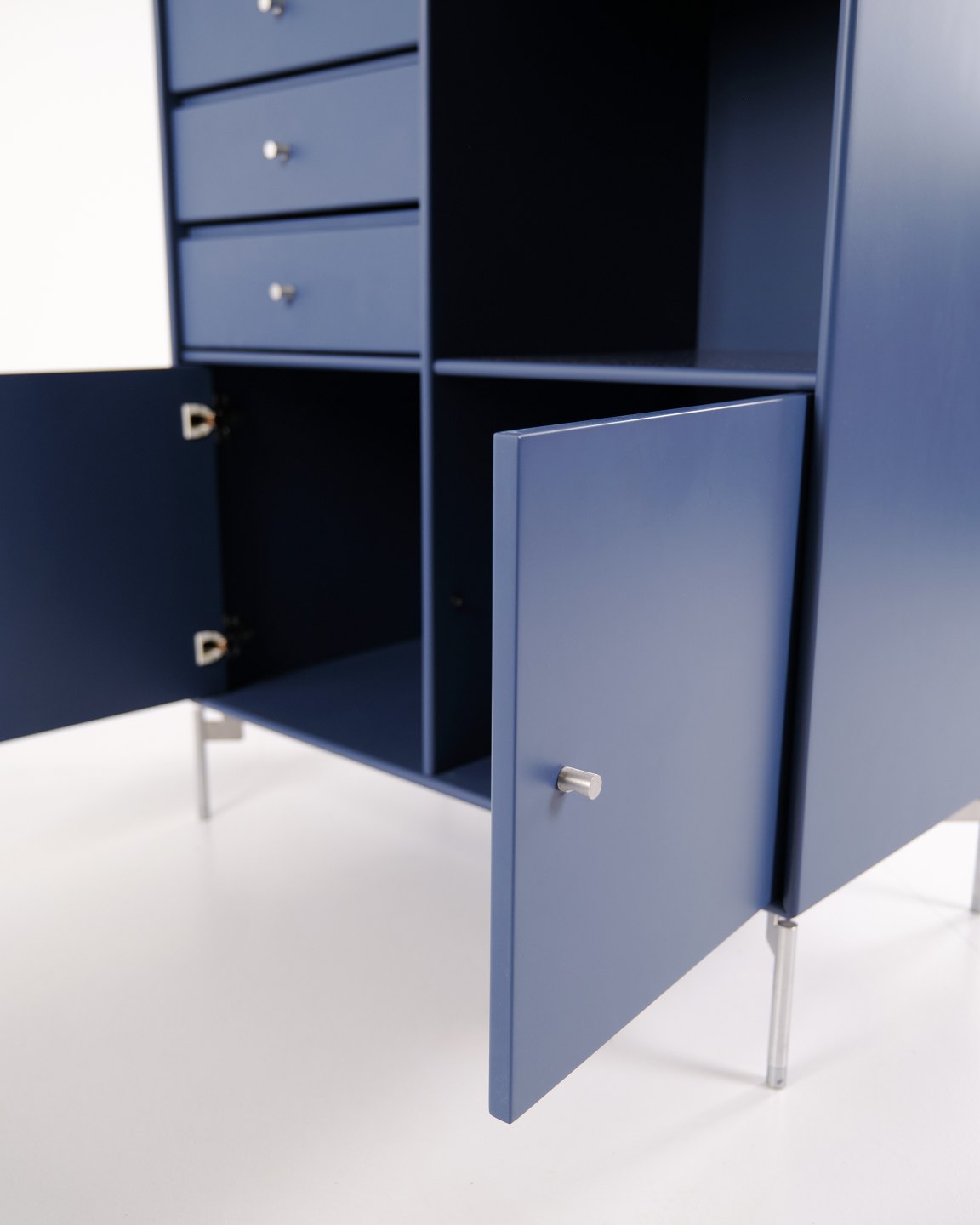 Beskrivelse: Montana kommode i blå med krom ben. Modulet er indrettet med tre skuffer og to låger, hvilket giver god og fleksibel opbevaringsplads. Klassisk Montana-design med enkel struktur og høj funktionalitet.