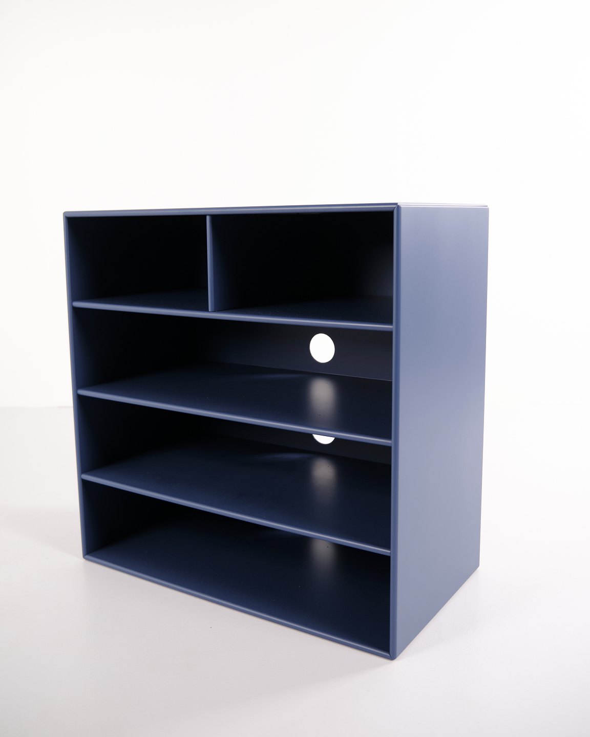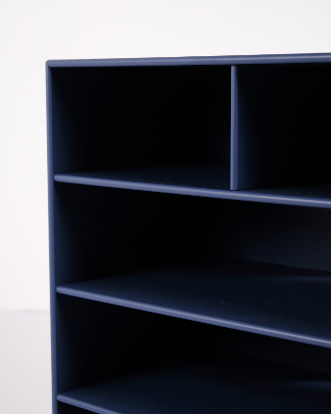 Beskrivelse: Montana reol i blå. Udstyret med fire åbne hylder, velegnet til opbevaring eller udstilling i stue, kontor eller entré. Et klassisk Montana-modul med enkel opbygning og høj funktionalitet.