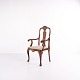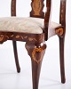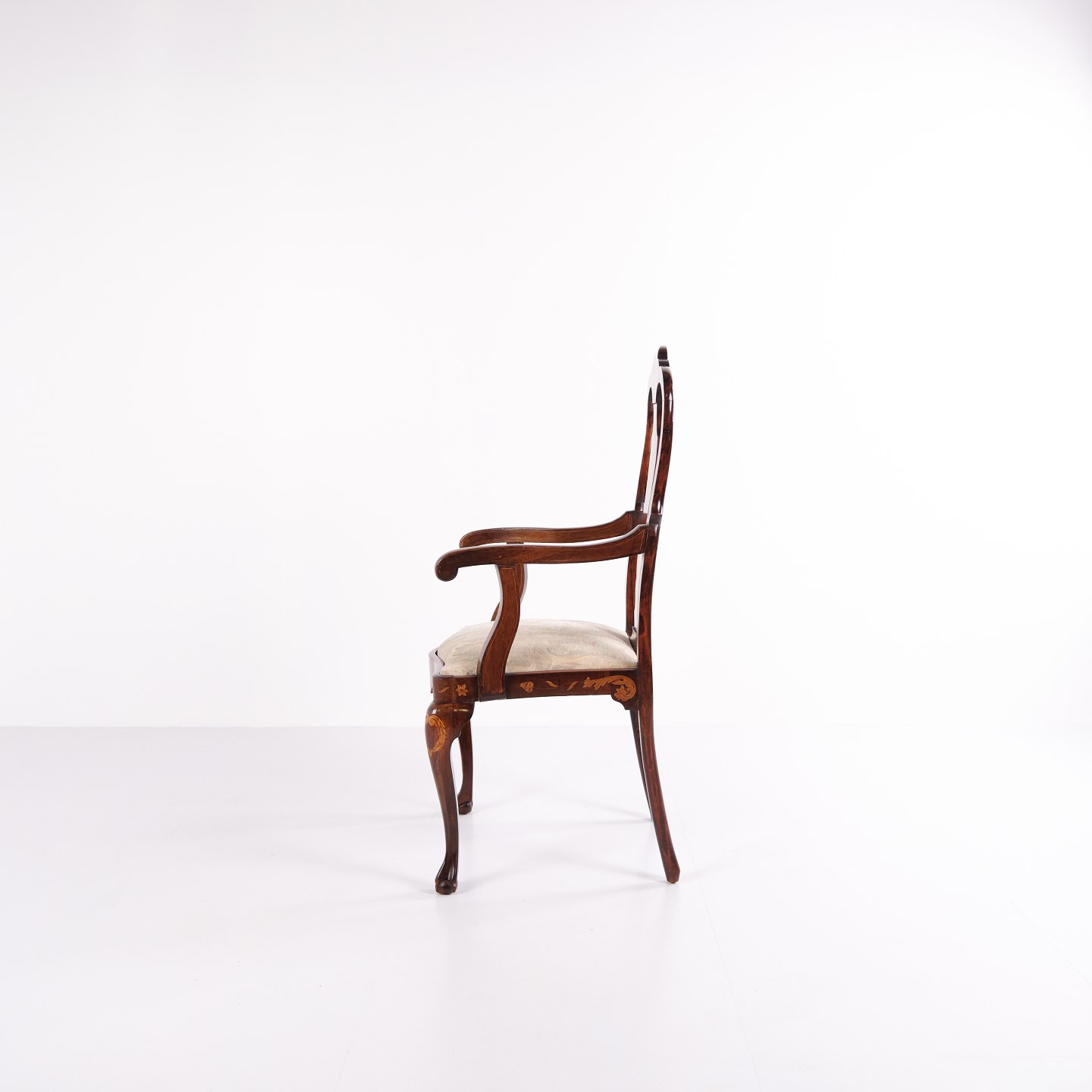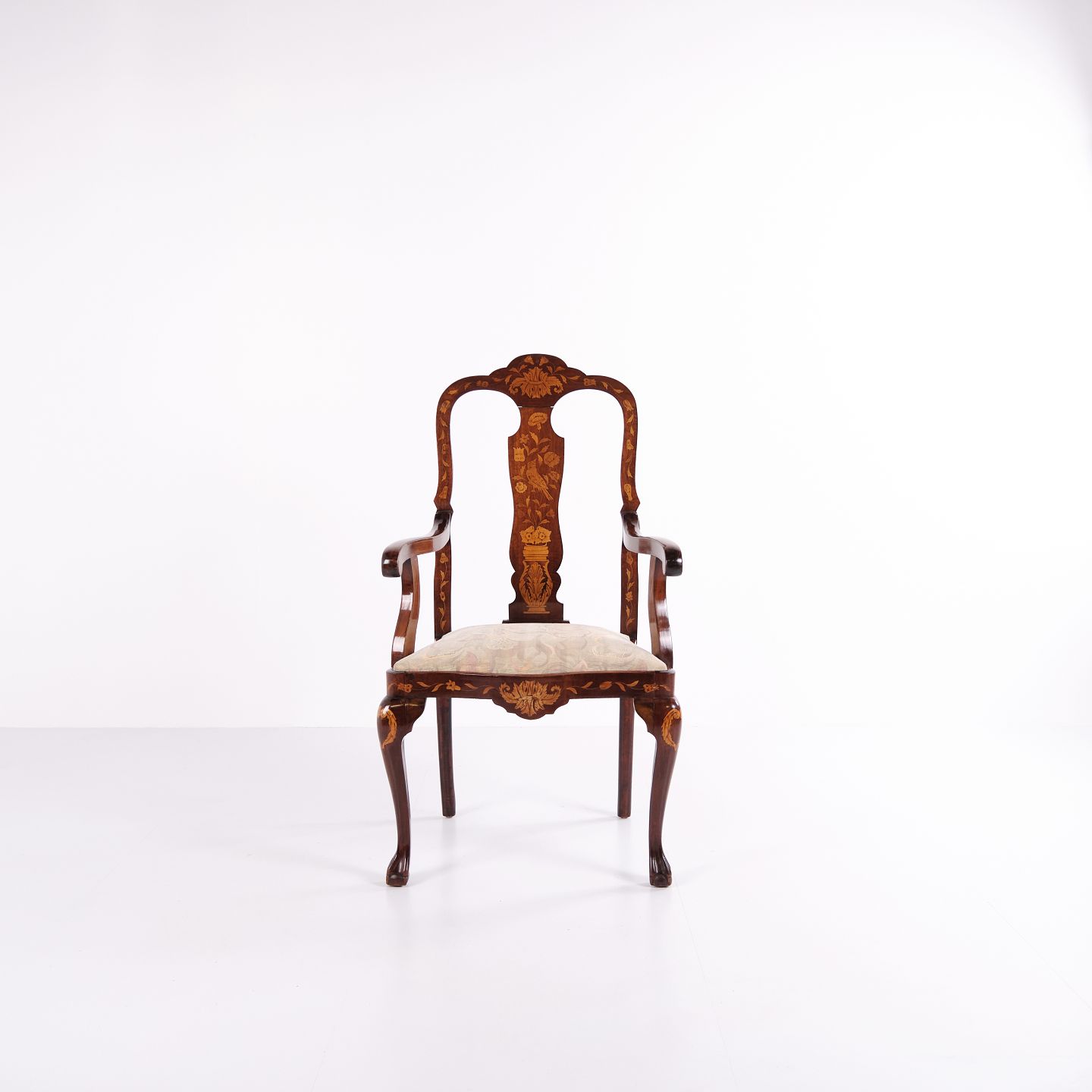Description: Mid-18th century armchair in Queen Anne style, crafted in walnut with detailed fruitwood inlay. The decoration features floral, bird and butterfly motifs. Finished with hand-polished shellac, enhancing the warm tone of the wood and the refined craftsmanship.