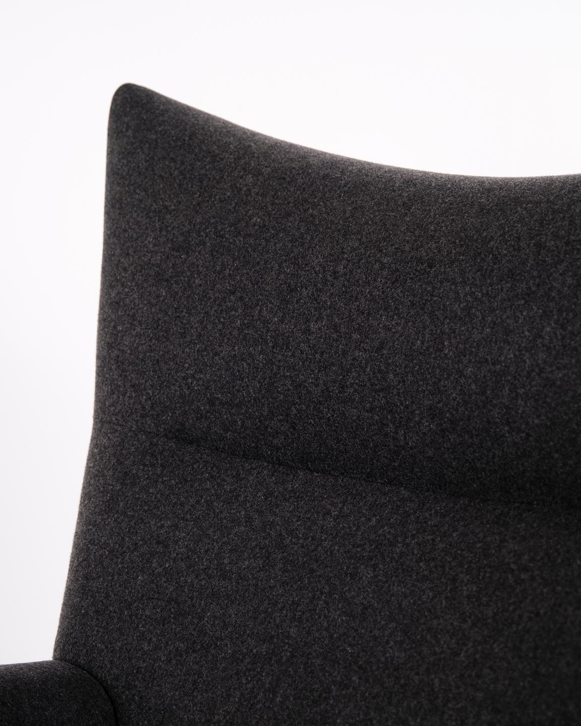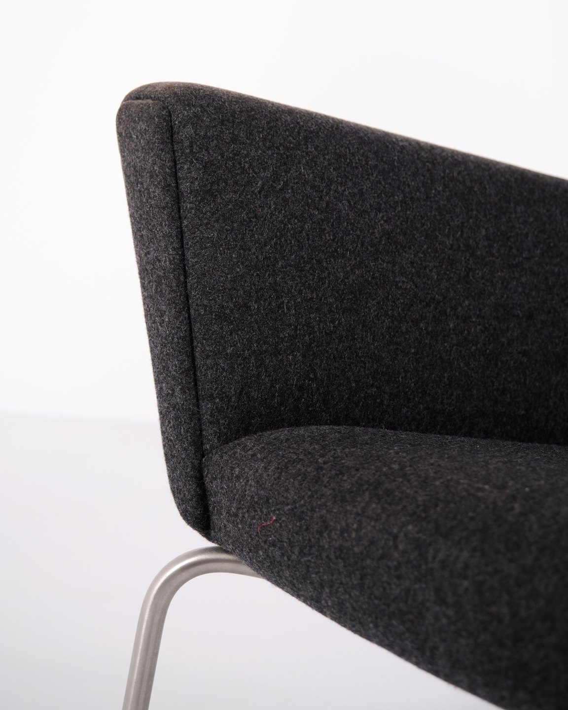 Beskrivelse: Wingchair CH445 designet af Hans J. Wegner og produceret af Carl Hansen & Søn. Udført i gråt Hallingdal-stof med tilhørende skammel i samme polstring. Klassisk Wegner-model med høj ryg, markante vinger og solid komfort. Et anerkendt dansk designikon.