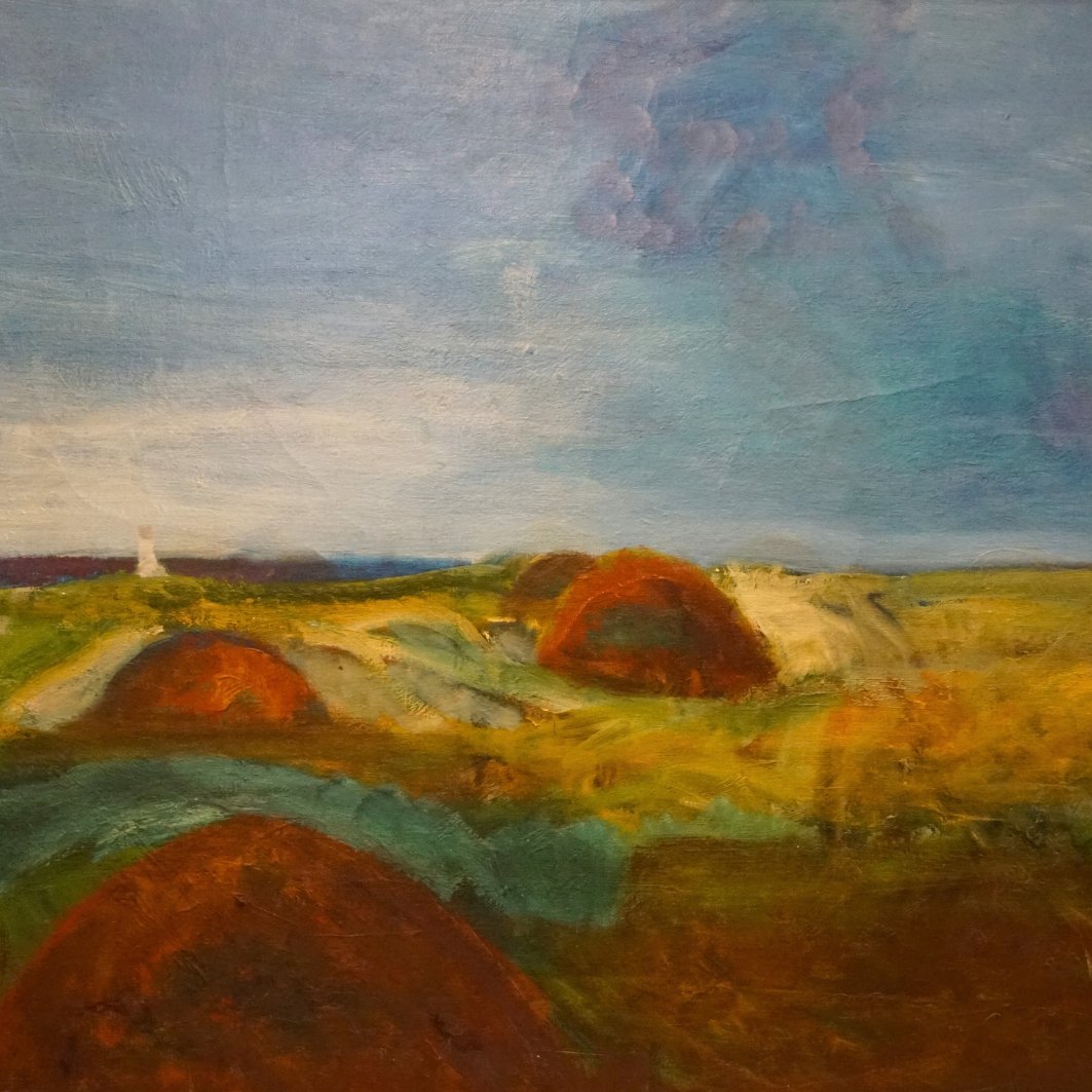 Beskrivelse: Jens Søndergaard; Landskabsmaleri med marker i forgrunden, samt tårn og hav i baggrunden. Olie på lærred.