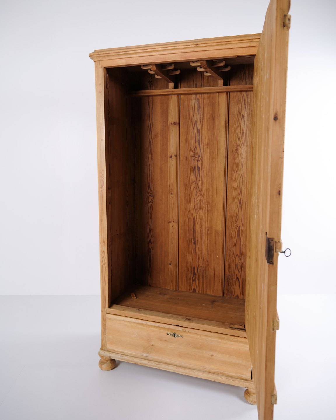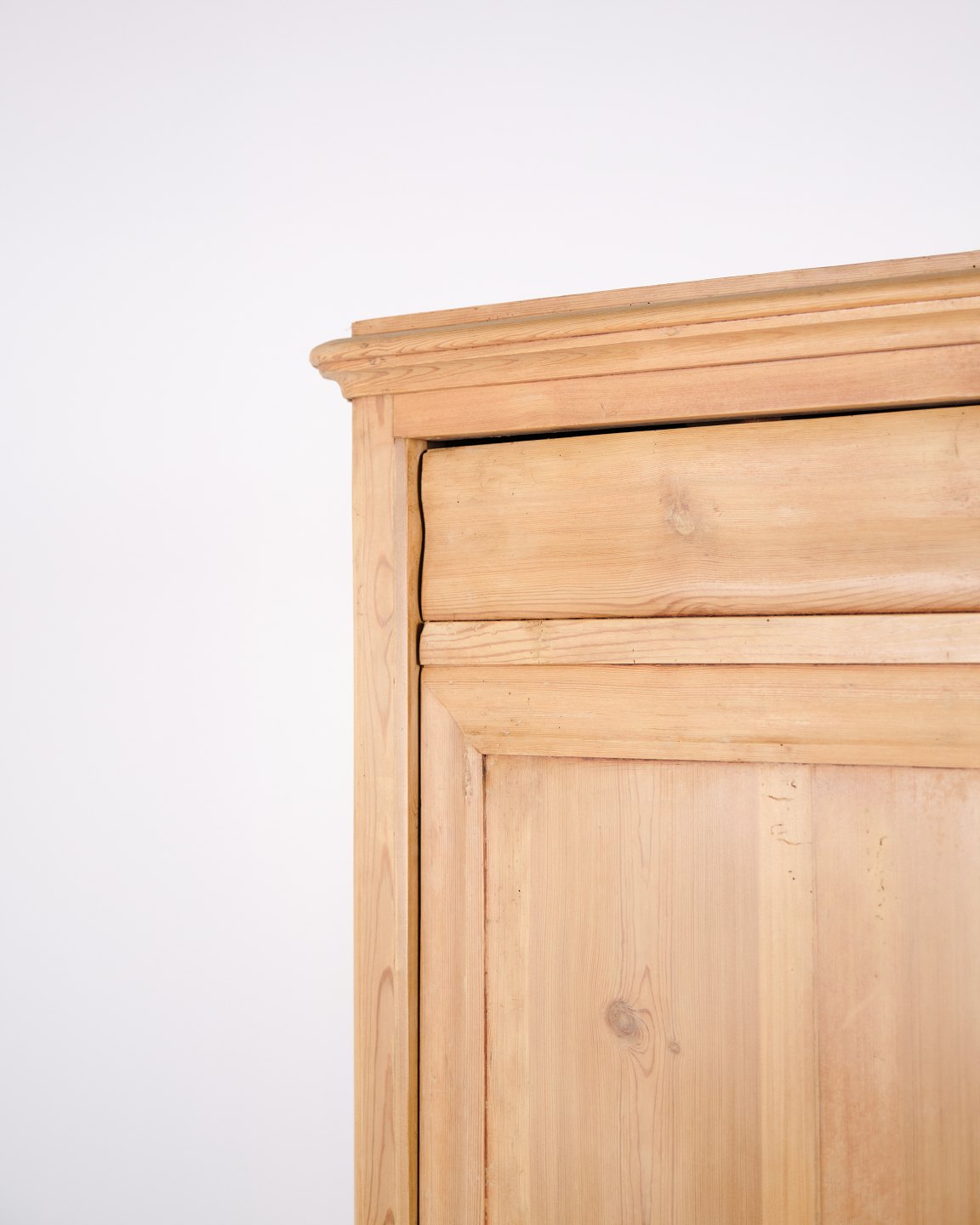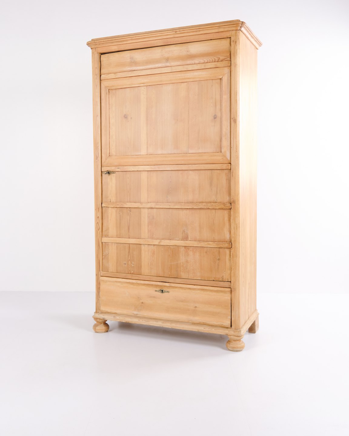 Beskrivelse: Karlekammerskab fra begyndelsen af 1900-tallet, udført i fyrretræ med et enkelt, klassisk formsprog. Skabet står på runde ben og har en frontlåge samt en praktisk skuffe nederst, hvilket giver opbevaringsplads.