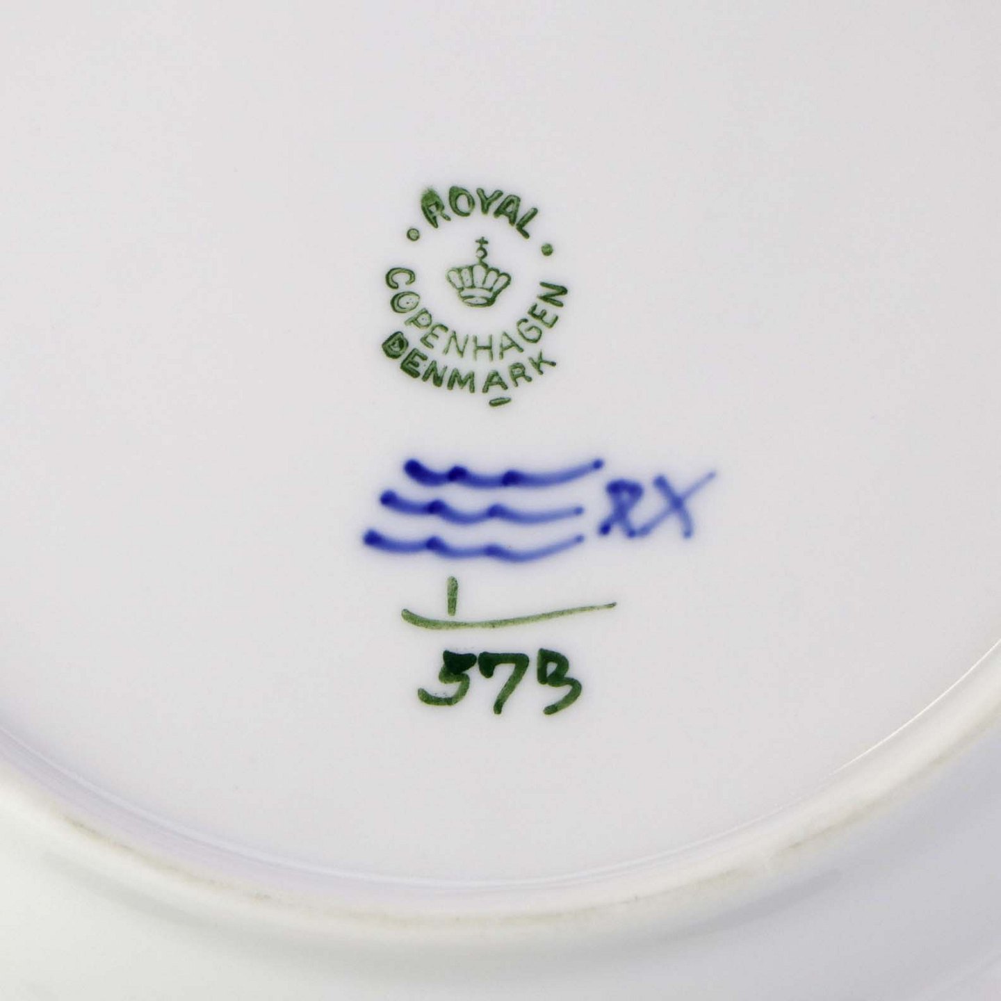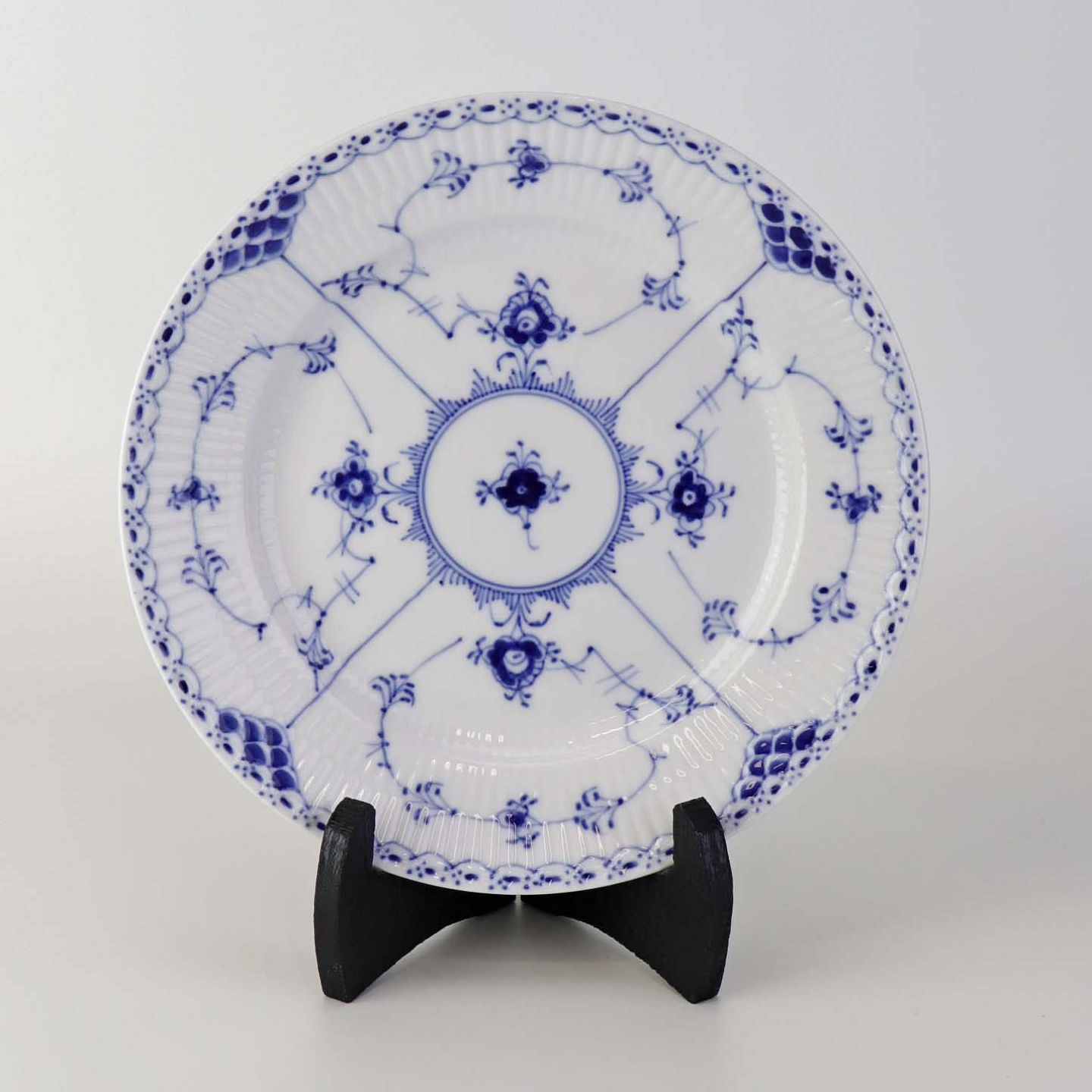Beskrivelse: Stor desserttallerken i kongeligt porcelæn fra stellet Musselmalet Halvblonde. Nr. 1/573