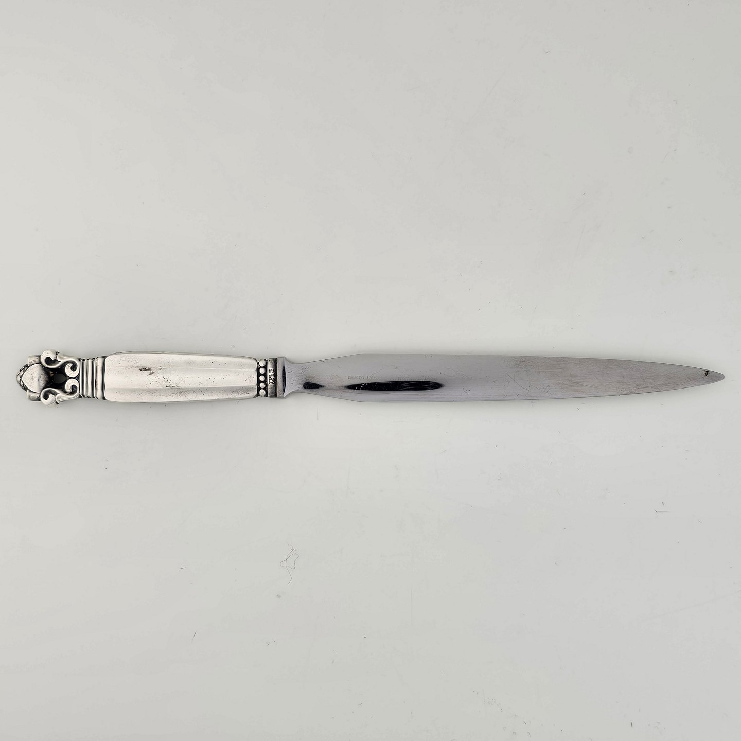 Beskrivelse: Kongemønster brevåbner med skæfte af sterling sølv 925 og knivsæg af rustfrit stål