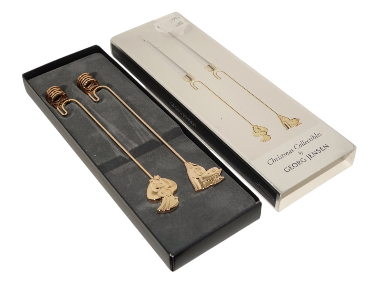 Beskrivelse: Georg Jensen Golden Christmas, pakke med to lysholdere med Engel og Jomfru Maria & Jesus fra 2012.
