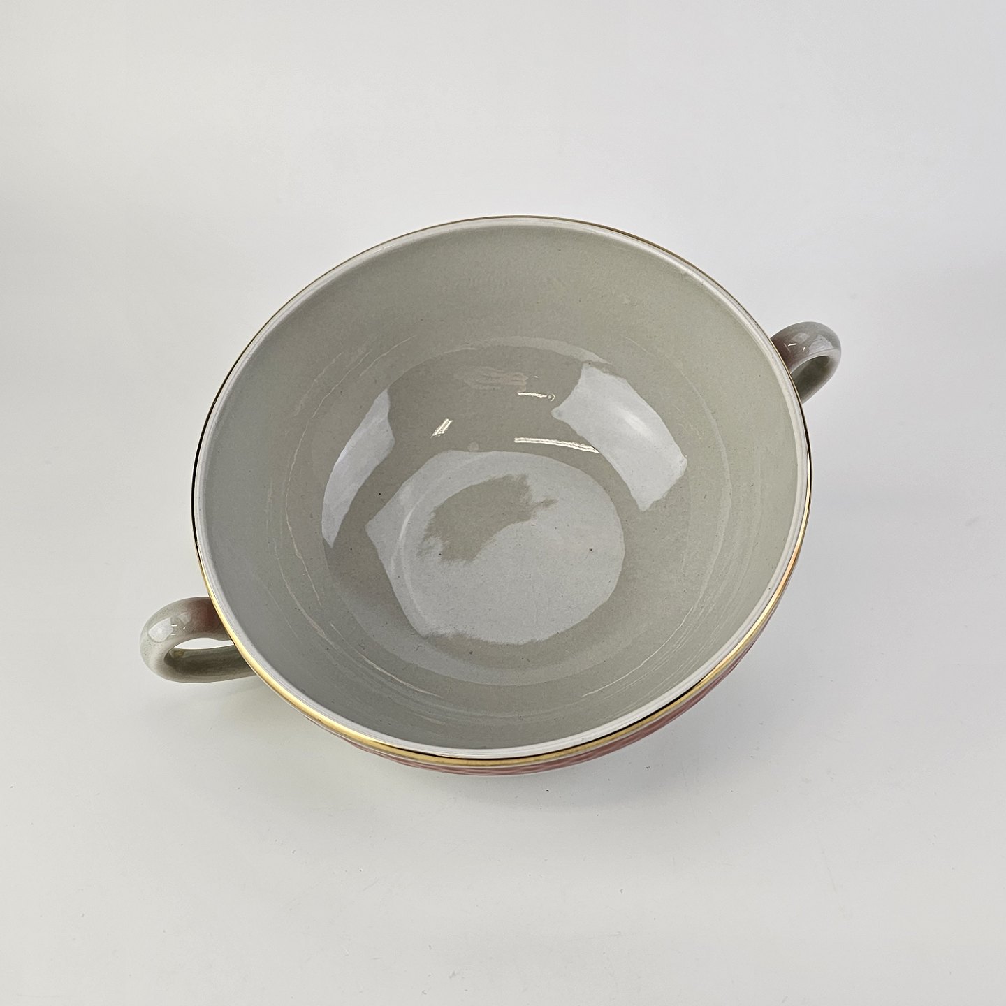 Tureby er stel i fajance dekoreret med rødt bånd og guldkant