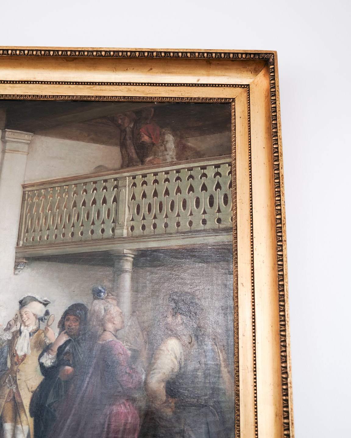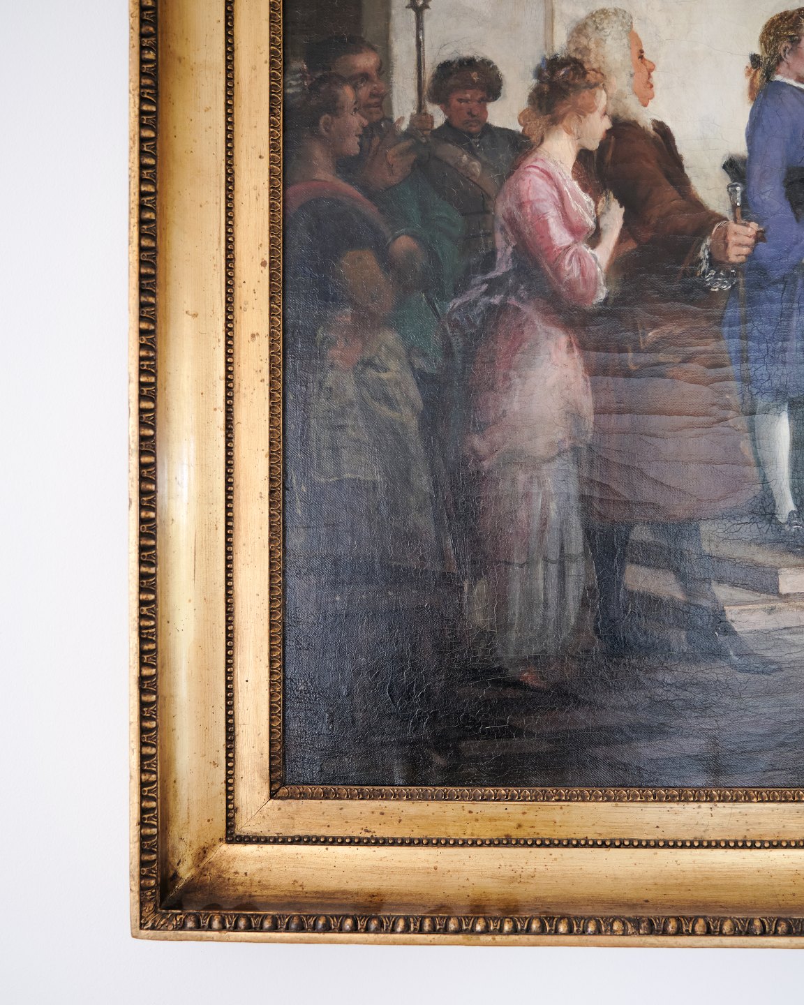 Beskrivelse: Olie på lærred tilskrevet Wilhelm Marstrand (1810–1873), udført som en scenisk fremstilling af afslutningen på Ludvig Holbergs komedie “Det Lykkelige Skibbrud”. Maleriet er usigneret og måler 95 x 135 cm. Ny Carlsberg Glyptotek ejer en anden version af motivet (90 x 127 cm), hvor både interiør og de afbildede personer adskiller sig fra dette eksempel. Nivaagaard ejer desuden en skitse til scenen, som viser både ligheder og variationer i forhold til de to malede versioner.