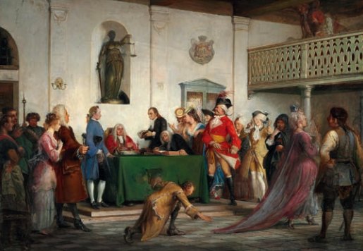 Maleriet viser den afsluttende retsscene, hvor alle er samlet for at høre dommen over Rosiflengius. Han dømmes til at bære den såkaldte “spanske kappe” – en straf, hvor en tønde med hul til hovedet sættes over den skyldige, som derefter føres gennem byen til offentlig spot. I Holbergs komedie straffes Rosiflengius for at uddele overdreven og ukritisk ros; hans navn betyder direkte “ros-på-må-og-få”.