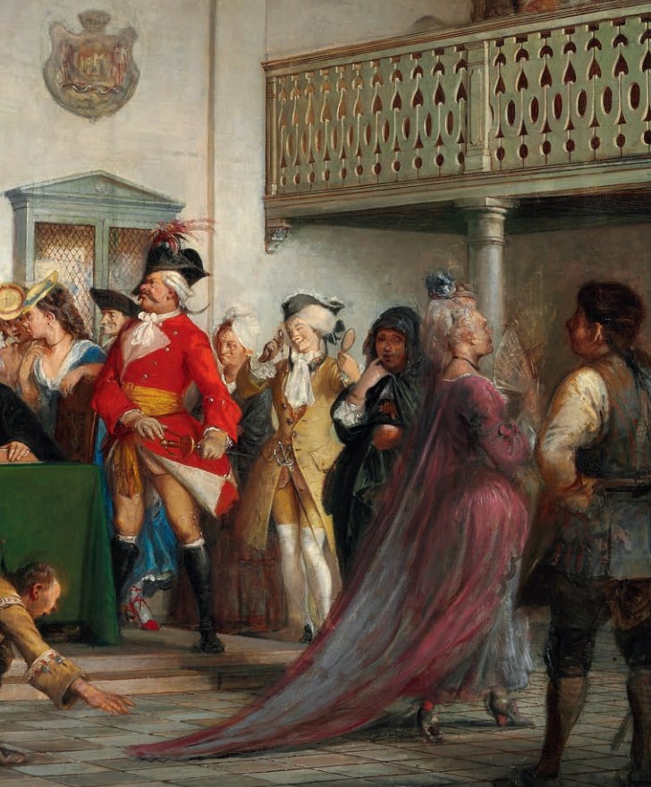 Ifølge Karl Madsen (1905) arbejdede Marstrand længe og omhyggeligt med kompositionen til dette motiv, hvilket fremgår af de mange forstudier. Han omtaler blandt andet placeringen af de markante personer i salen – især den talende officer med fjerprydet hat og den stolte adelsdame, som begge er fremhævet i billedet.