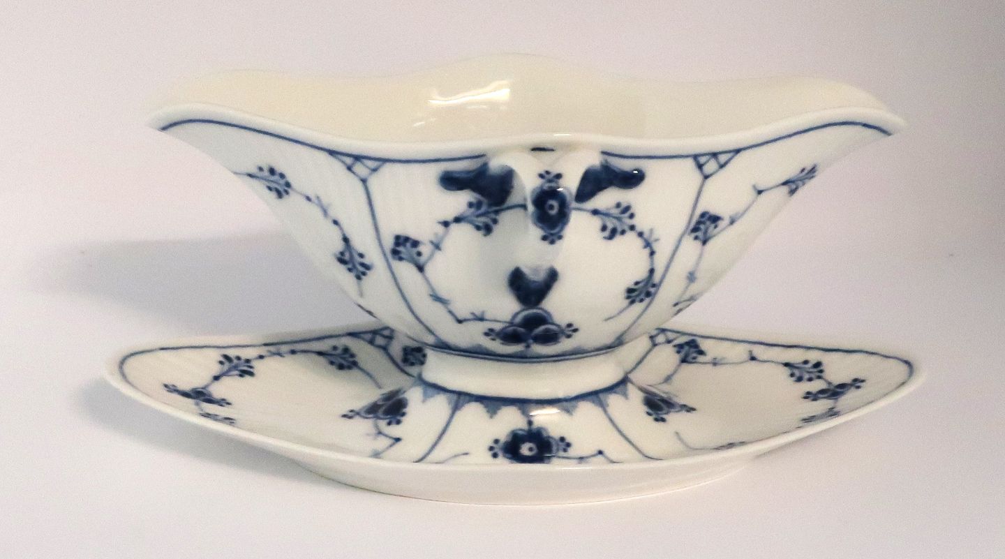Beskrivelse: Royal Copenhagen. Musselmalet riflet. Sauceskål / sovseskål. Model 202. Længde 24,5 cm. (1 sortering). Produceret før 1923.
