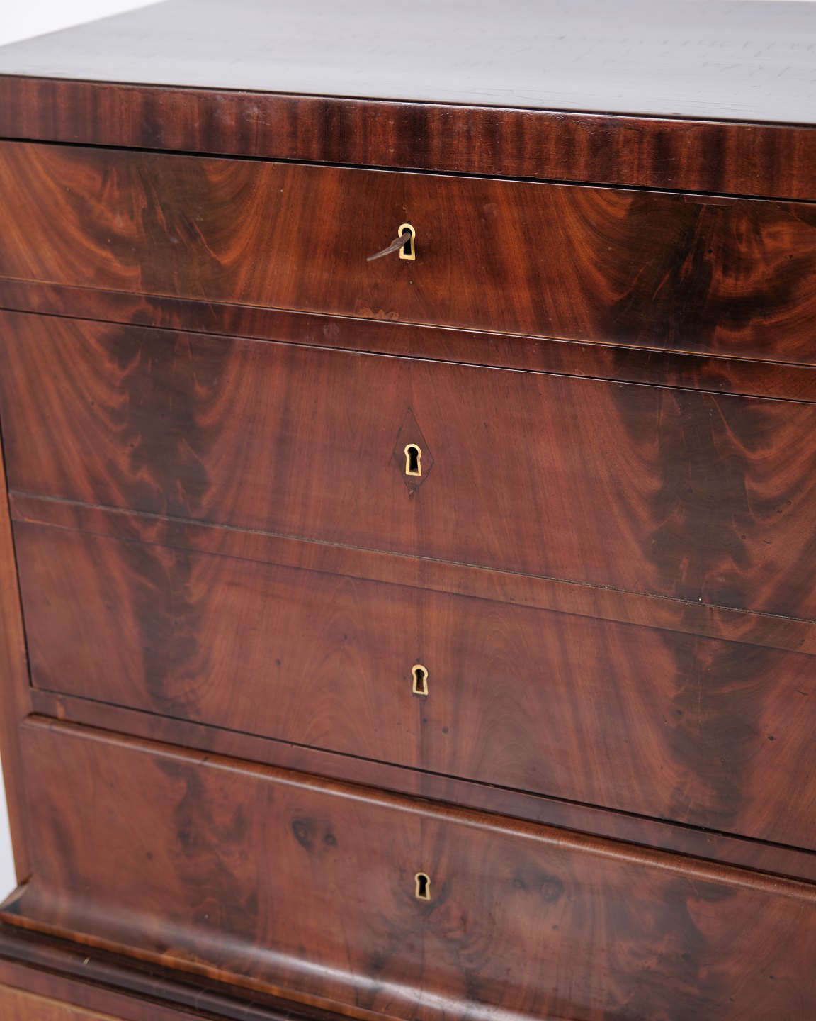 Beskrivelse: Sen Empire kommode fra 1840’erne, udført i flammet mahogni med fire skuffer på sokkel. Overfladen er nænsomt fransk håndpoleret, hvilket fremhæver træets dybe glød og struktur. Et smukt og klassisk antikmøbel fra perioden.
