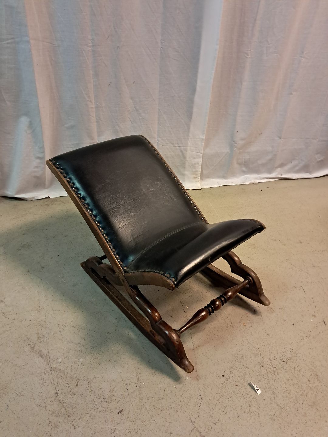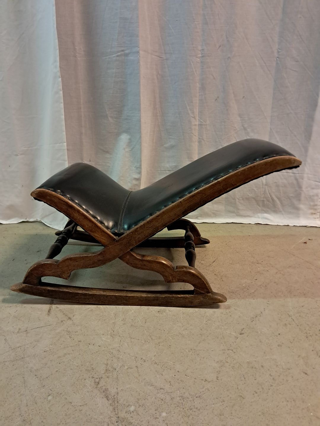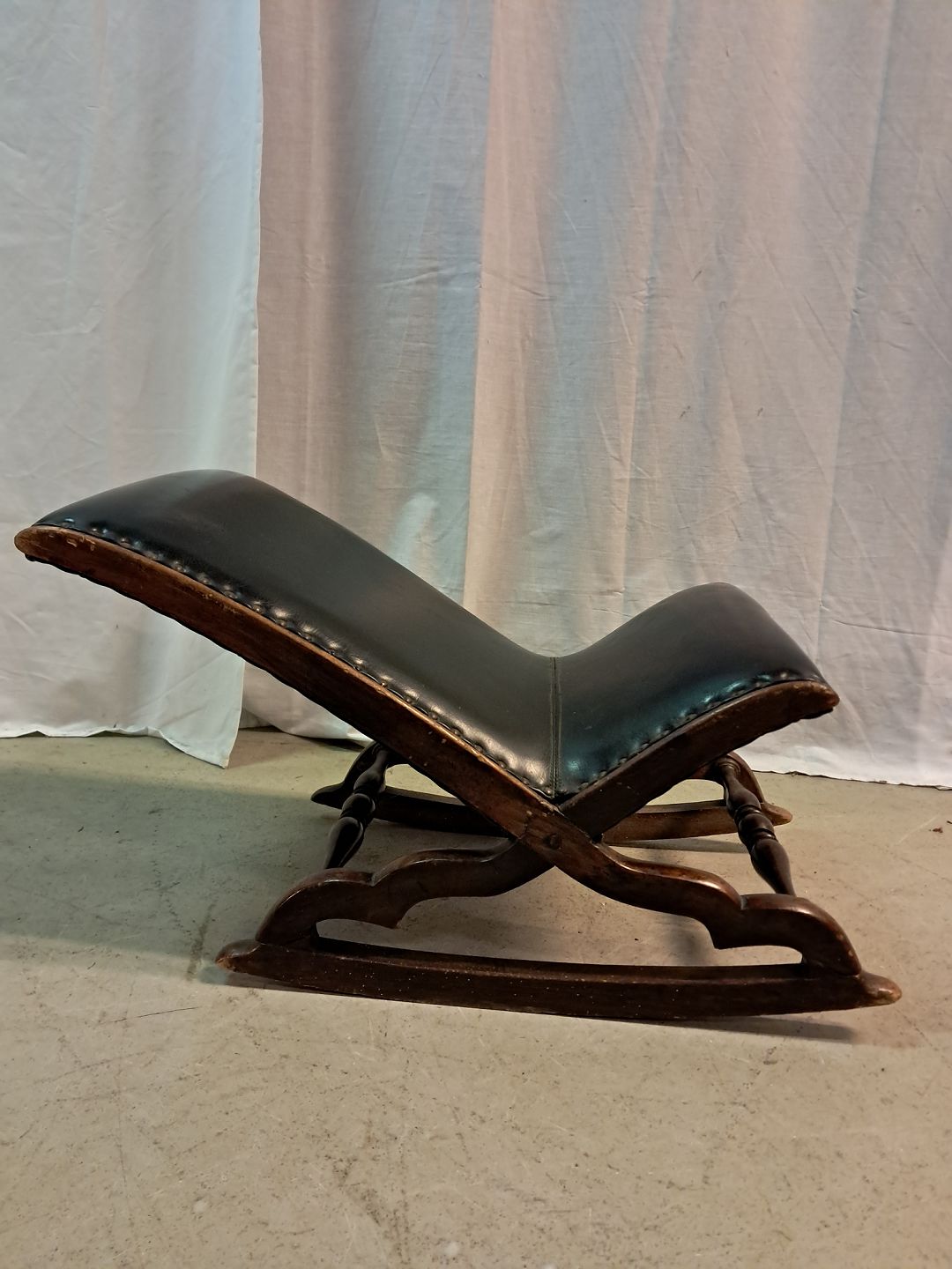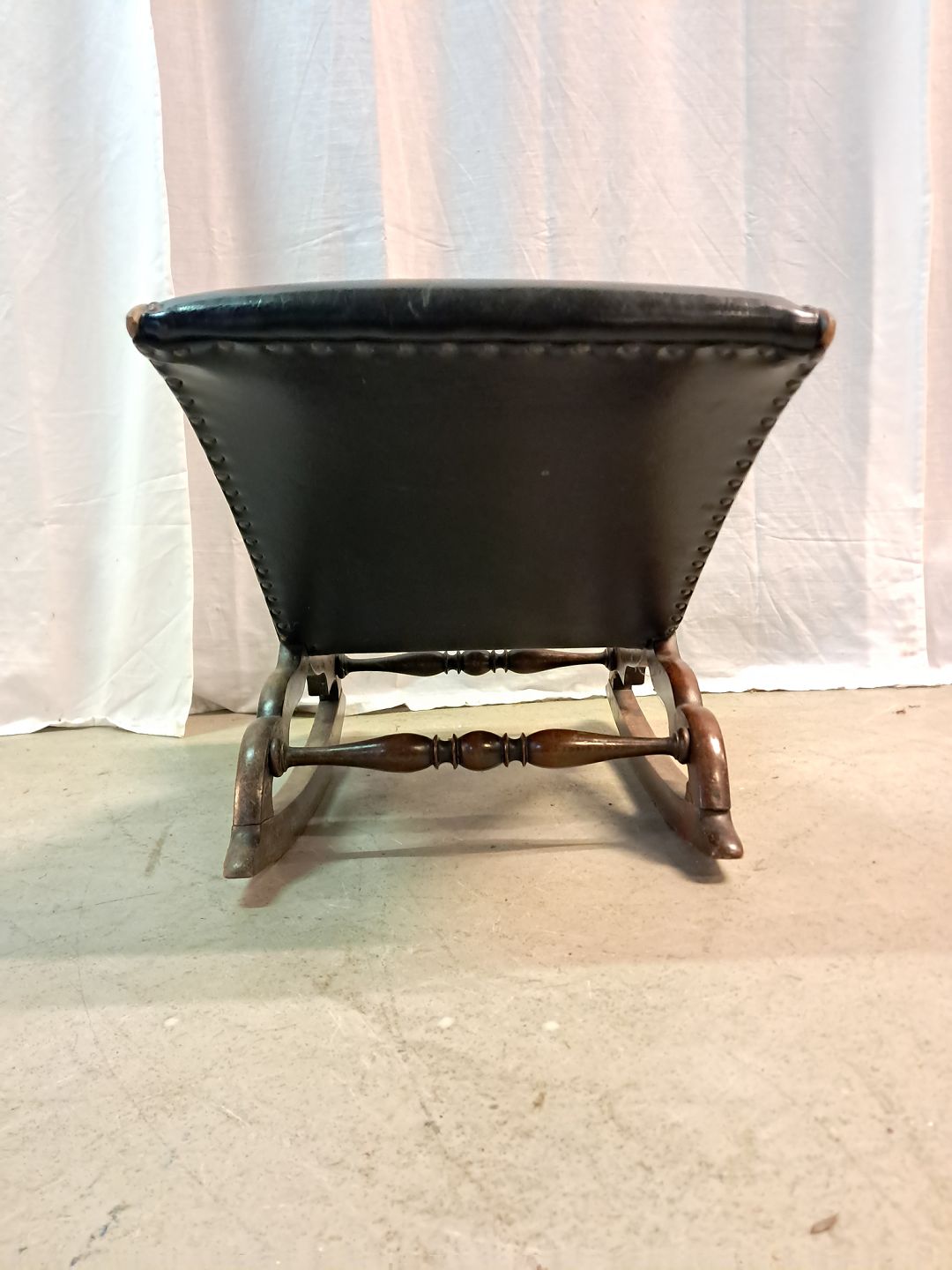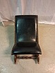 Beskrivelse: Skammel i bøgetræ og kunstlæder, fra 1920erne.