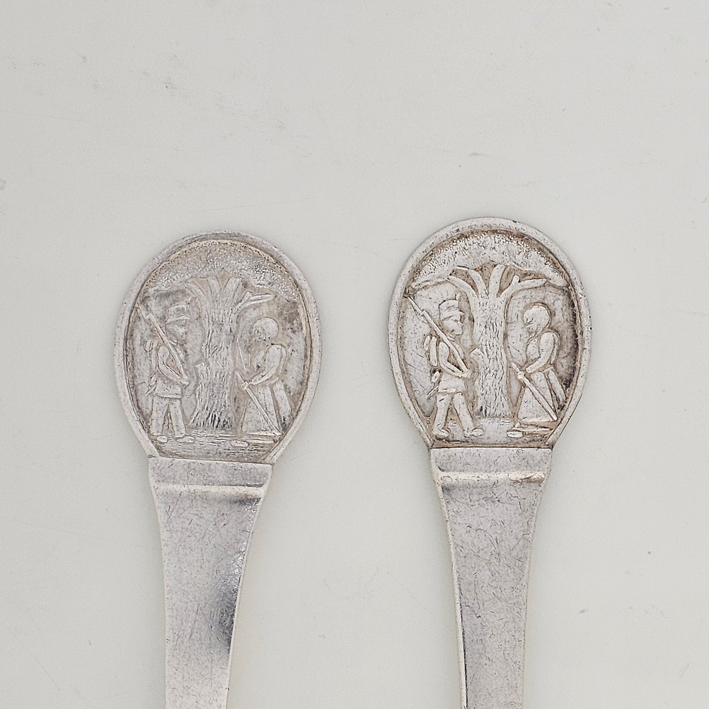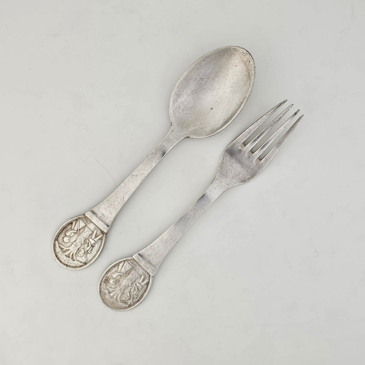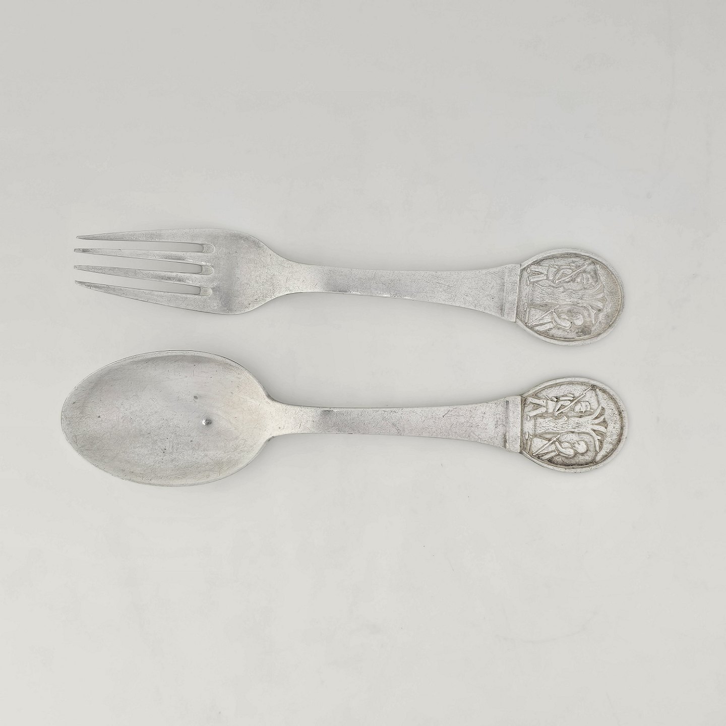 Beskrivelse: Gaffel og ske af pletsølv med motiv af H.C. Andersens Fyrtøjet