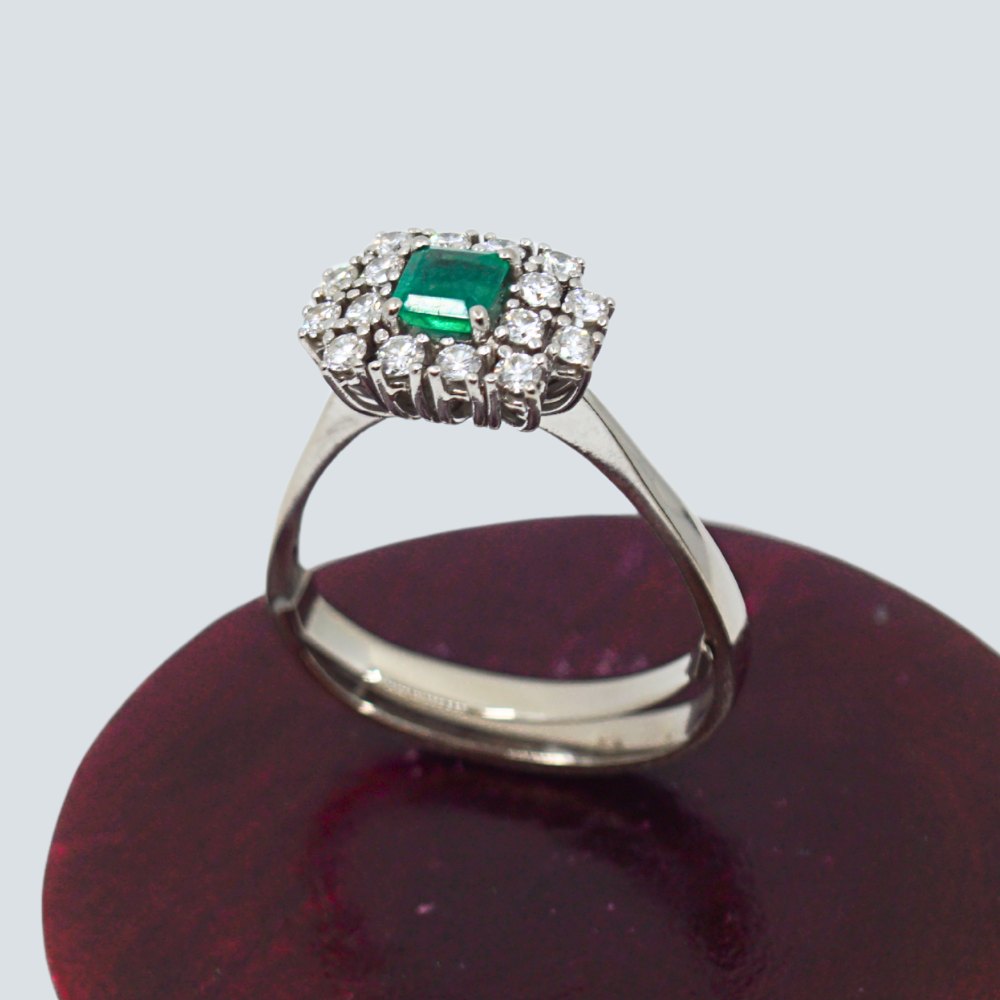 Beskrivelse: Carl Antonsen; Ring i 14 kt. hvidguld, prydet med diamanter og smaragd. Omkring ring str. 61. Med aftagelig skinne, som gør ringens størrelse mere fleksibel.