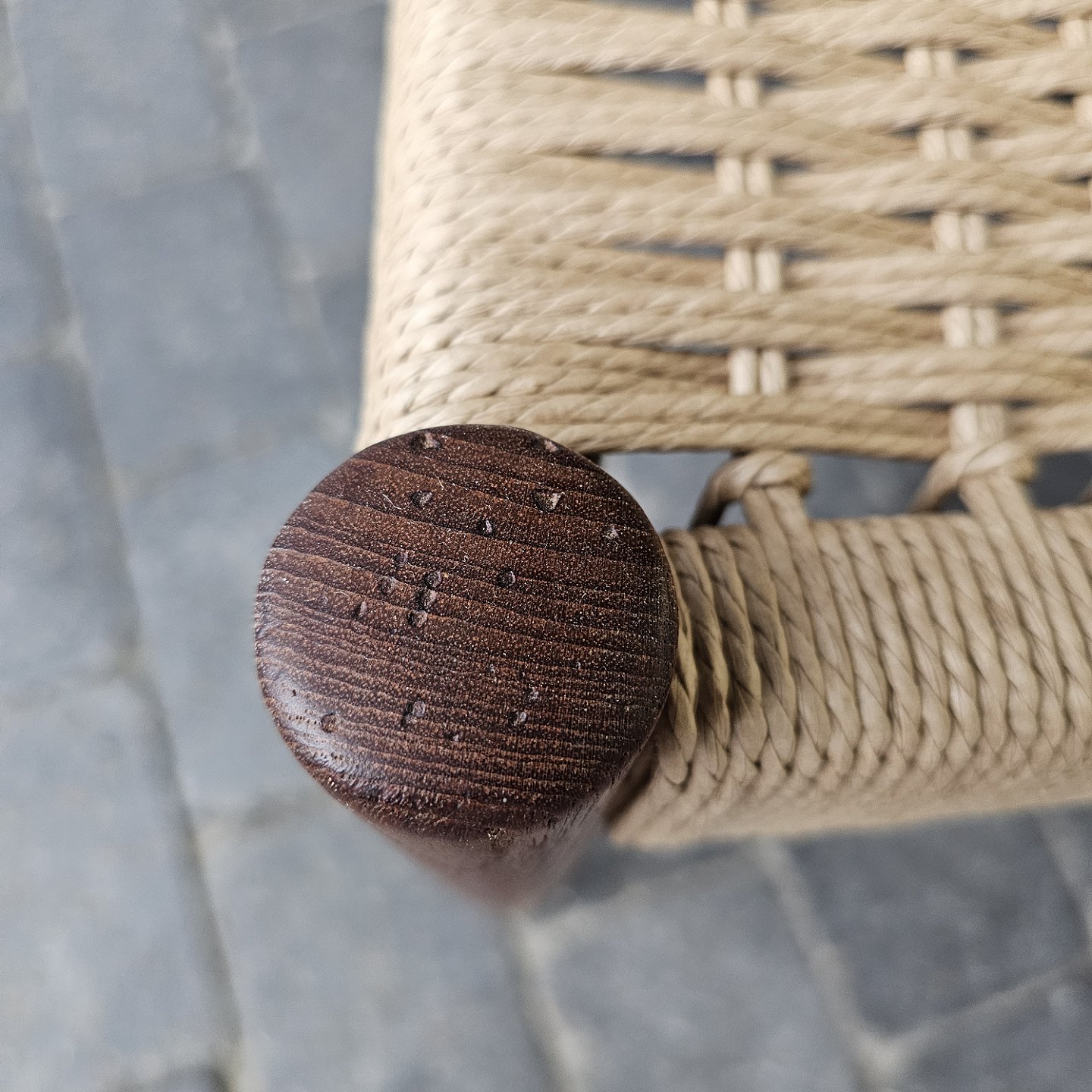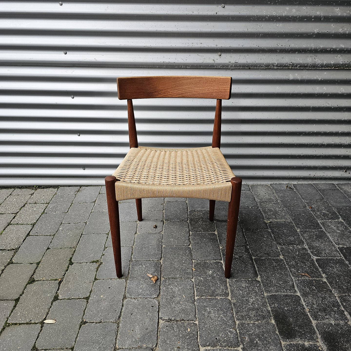 Beskrivelse: 4 spisebordsstole i teak med nyflettet sæder, originalt bundet.