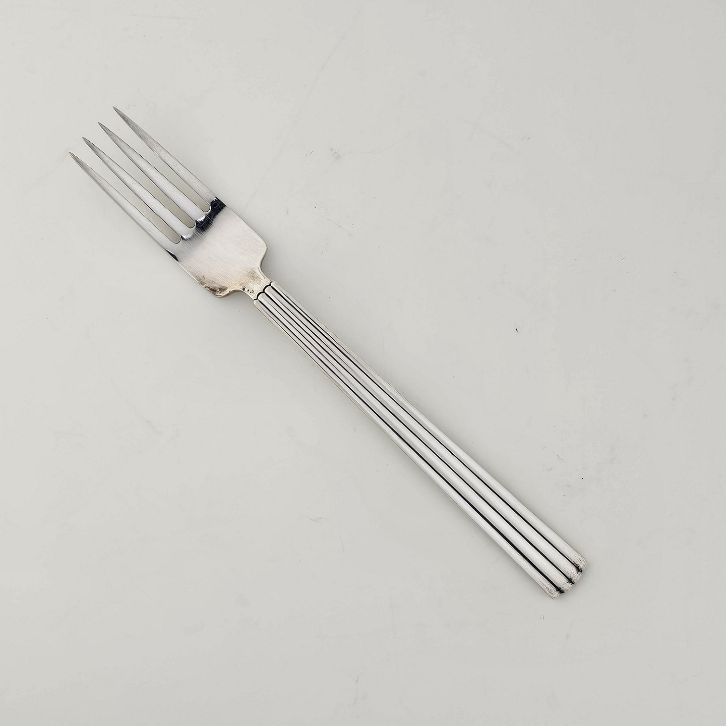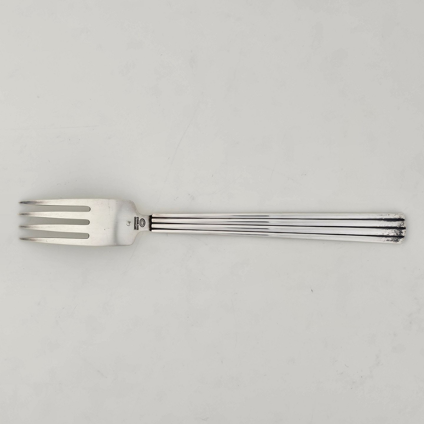 Beskrivelse: Barnegaffel i sterling sølv skaft dekoreret med striber