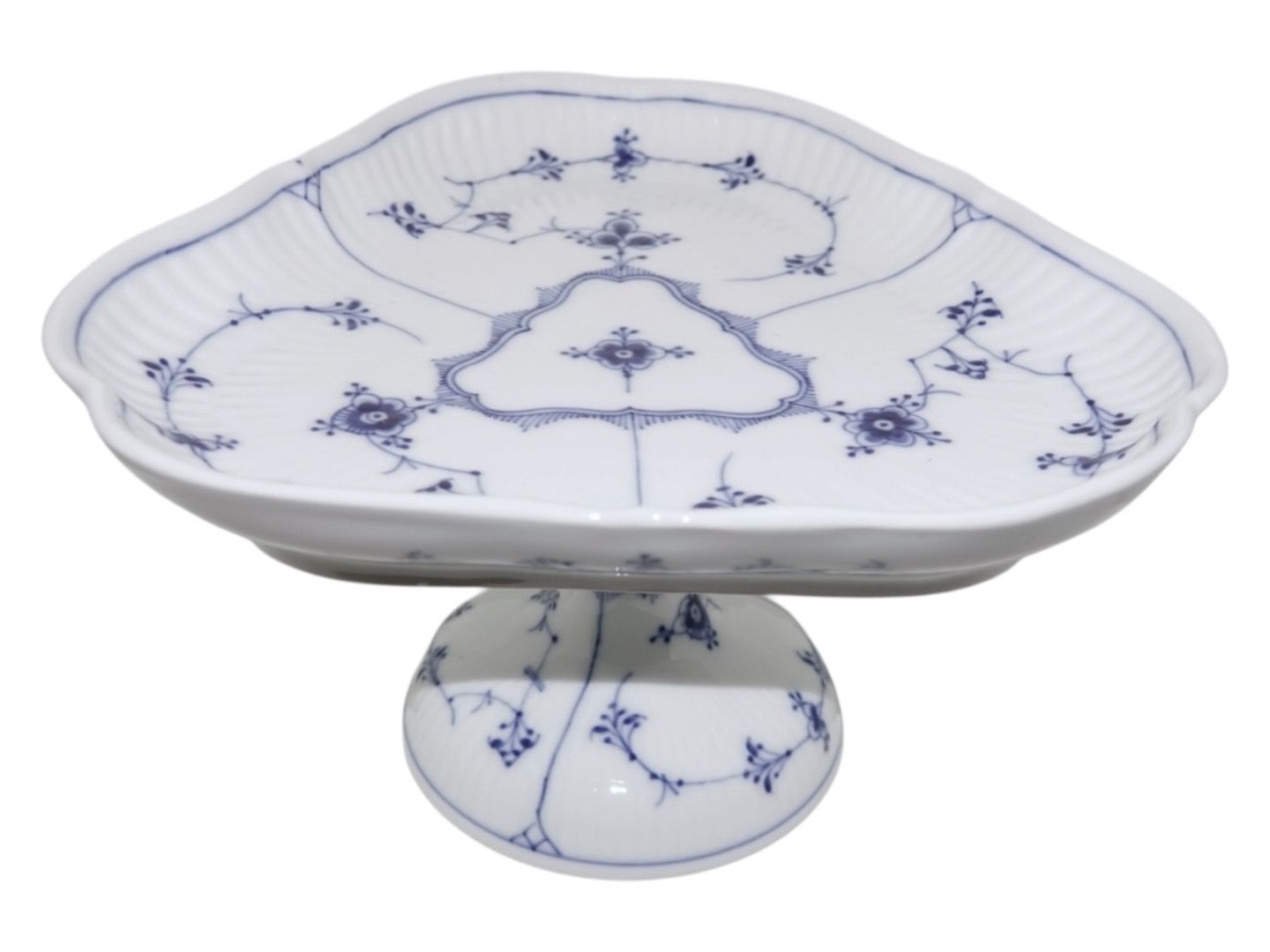 Beskrivelse: Royal Copenhagen Musselmalet Riflet, sjælden set trekantet kageopsats på fod.