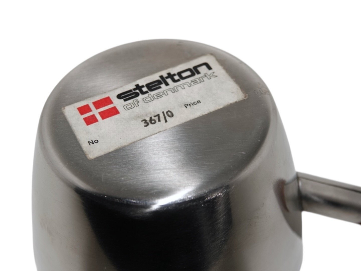 Description: Stelton stainless steel, small gray boat with teak wood handle.